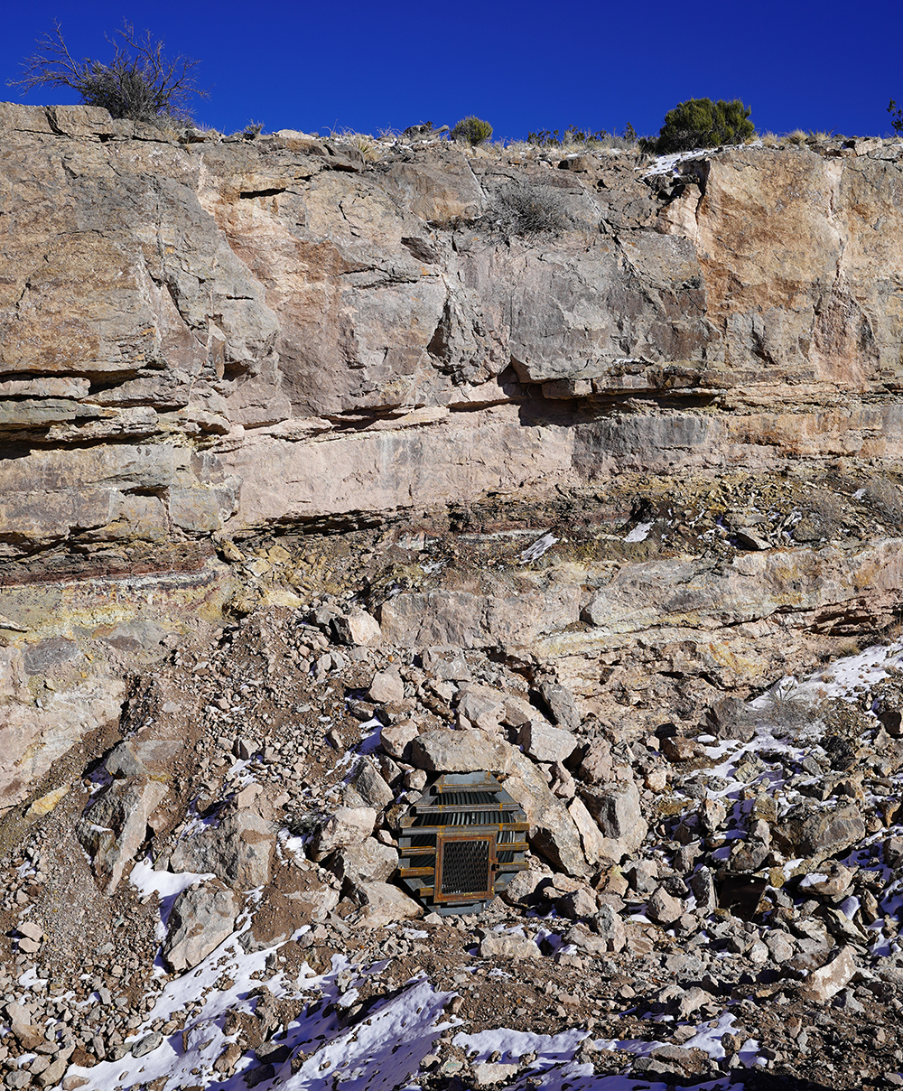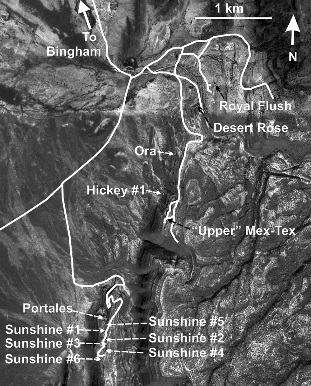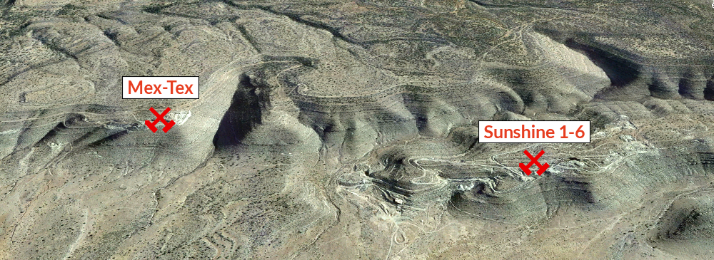 Satellite view to the east with marked Mex-Tex Mine and Sunshine adits. Mex-Tex mine with recently secured portals.