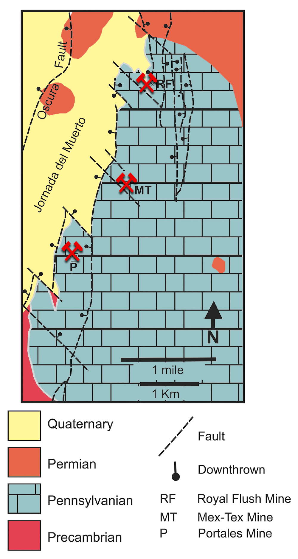 Geological map of the Bingham area. Mineralization occurs in Carboniferous limestones. Marked as "P" (Portales Mine) are Sunshine adits. Graphic from Rakovan & Partey 2009 (colored).