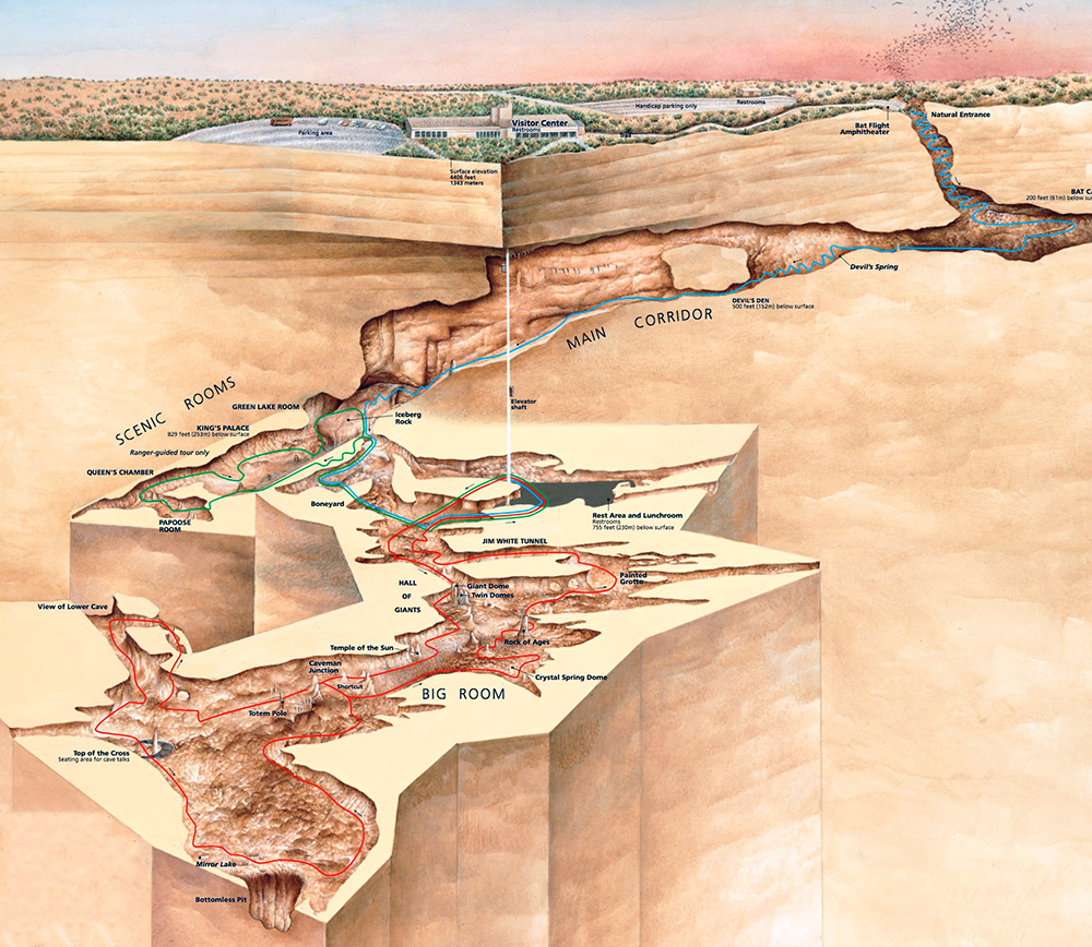 Plan of the Carlsbad Caverns. They developed in Permian age limestones. The park contains over 119 caves. The biggest one is over 220 km long and almost 500 m deep!