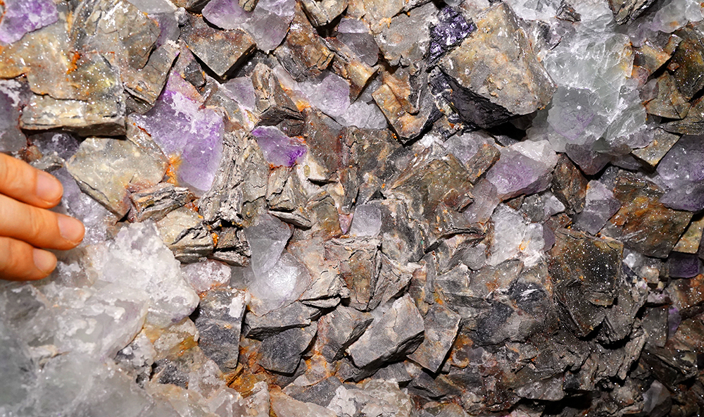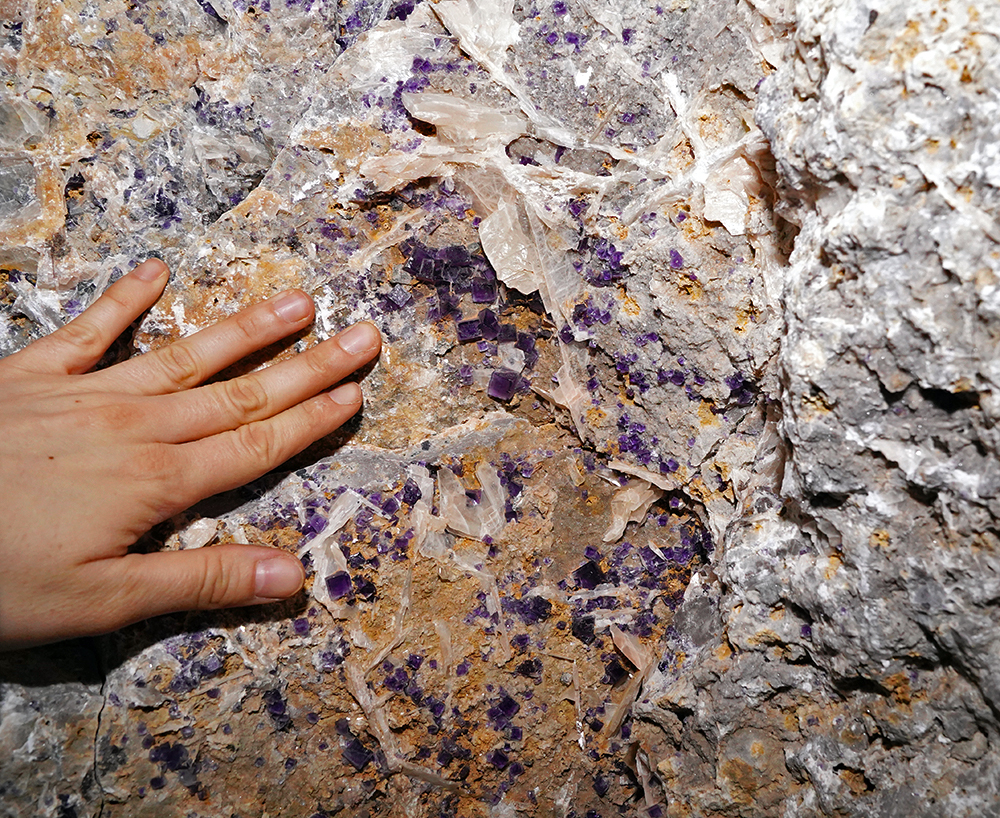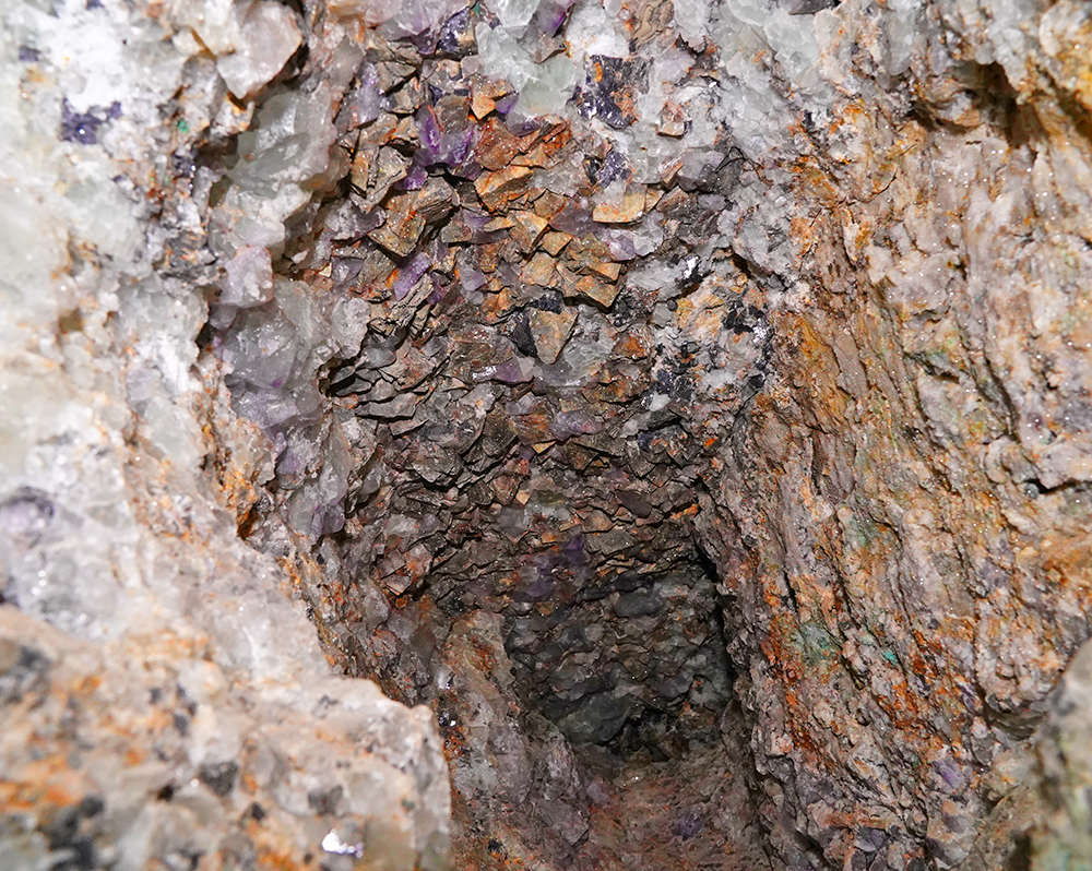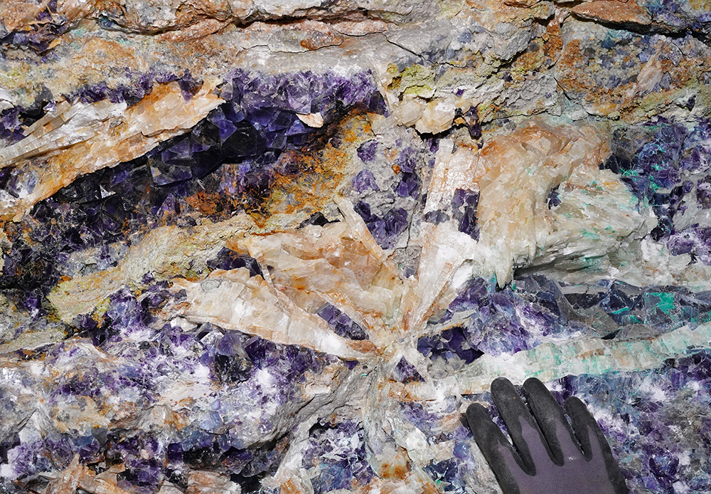 Tom collecting purple fluorites. Big baryte blades and purple fluorites in very cavernous area. Cavern with baryte blades and purple fluorites.