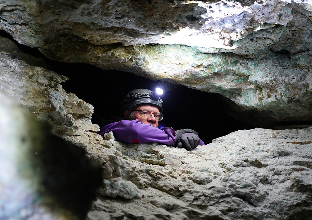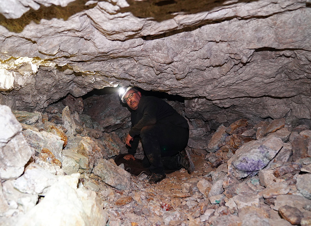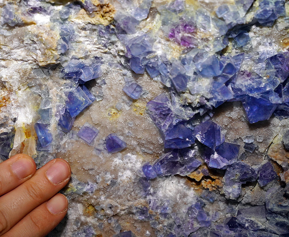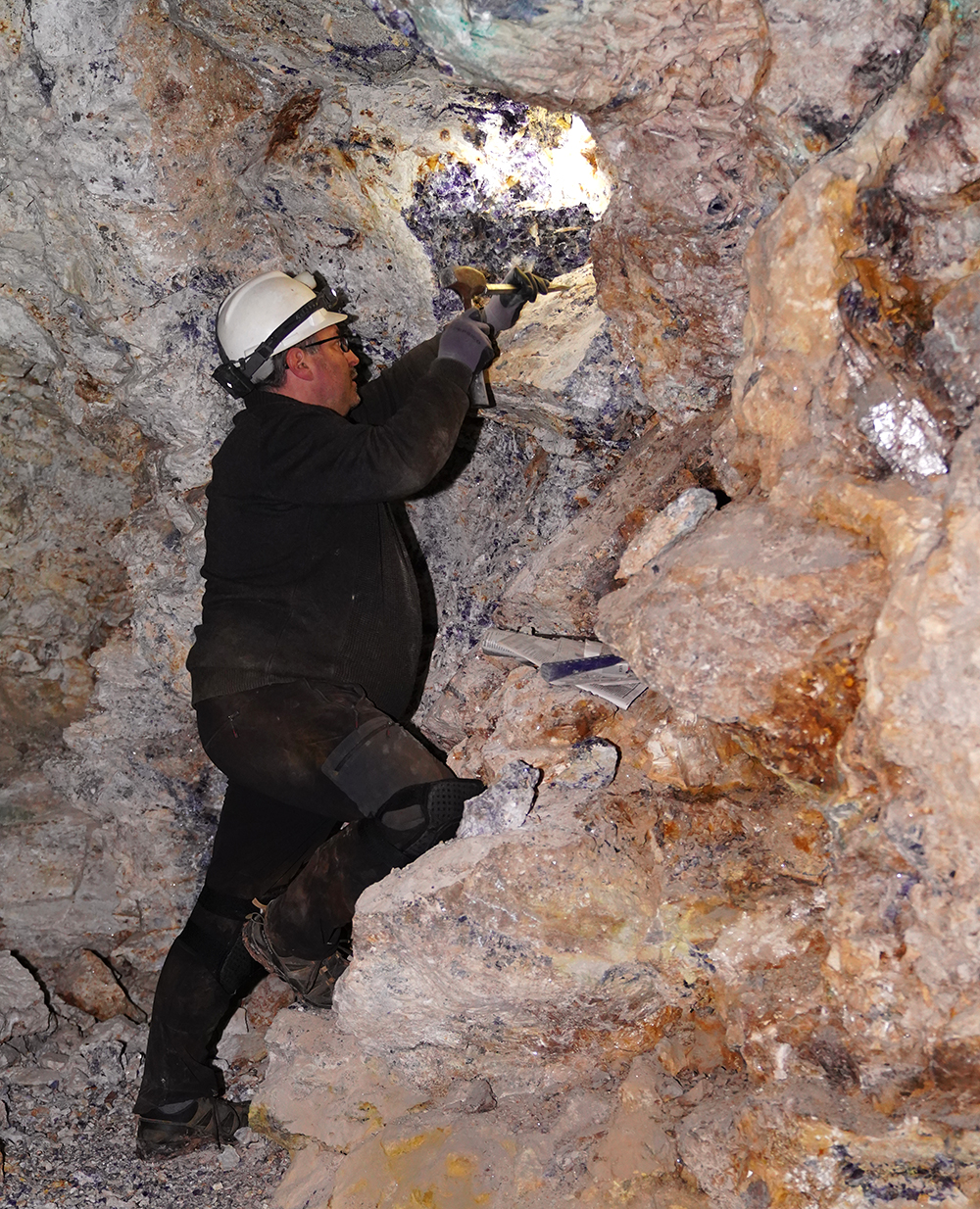 Tom collecting purple fluorites. Big baryte blades and purple fluorites in very cavernous area. Cavern with baryte blades and purple fluorites.
