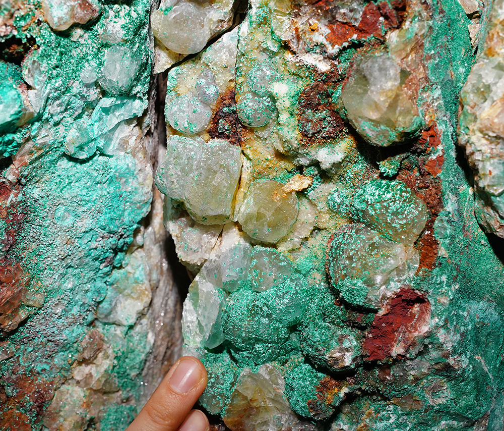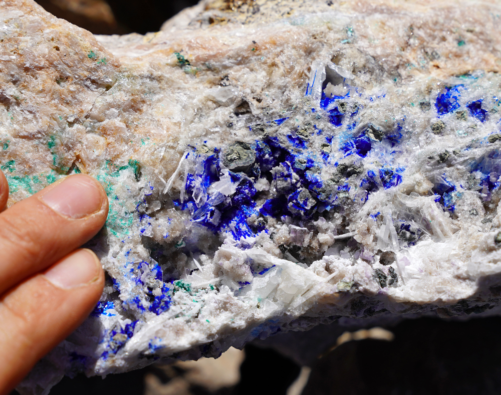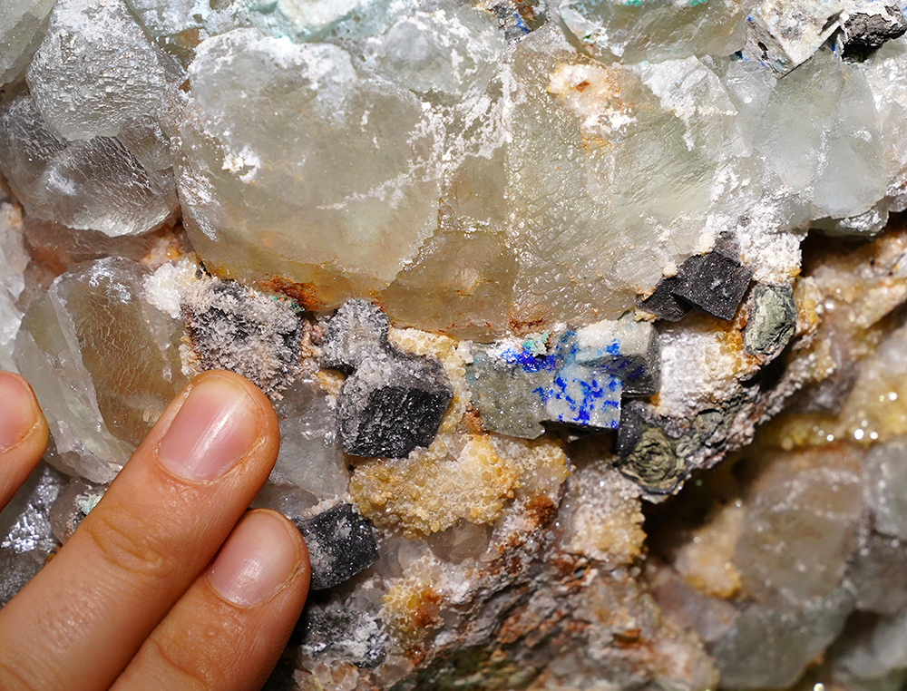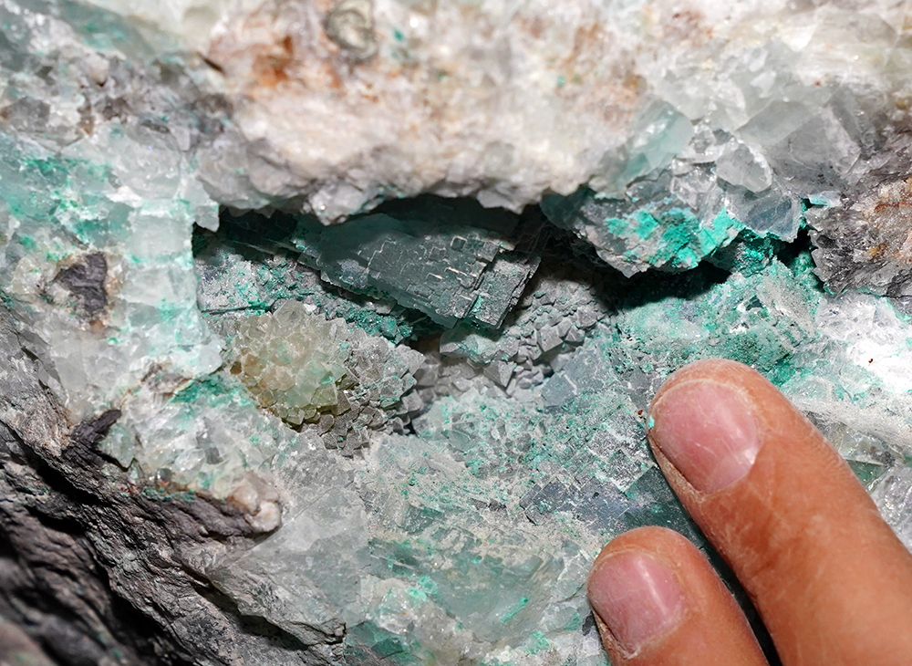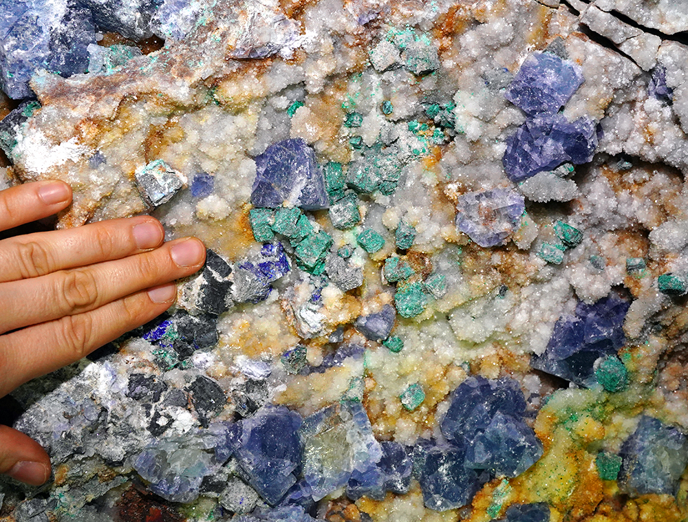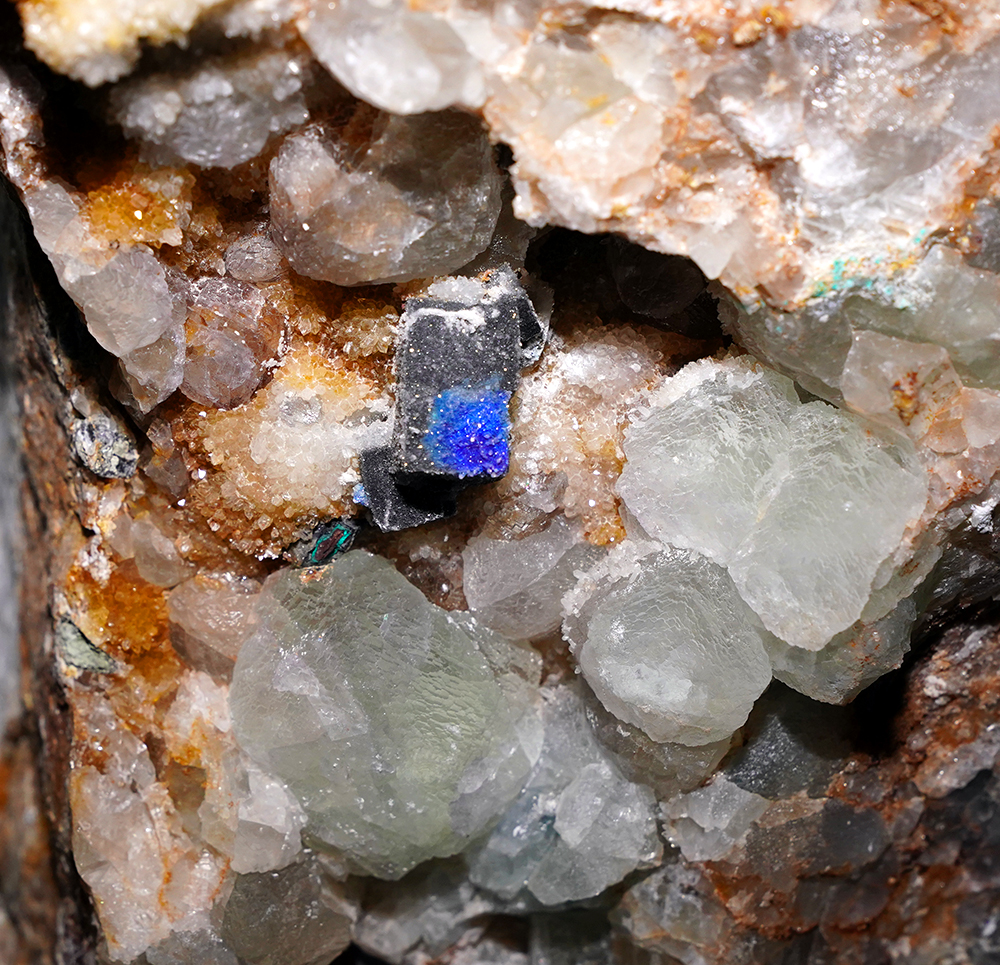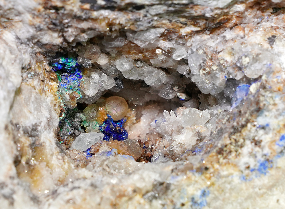 Details of the cavity with blue fluorite on quartz with malachite/brochantite coating galena.
