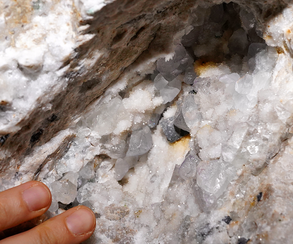 Details of the big cavity with fluorite and galena coated by sparkly quartz film.