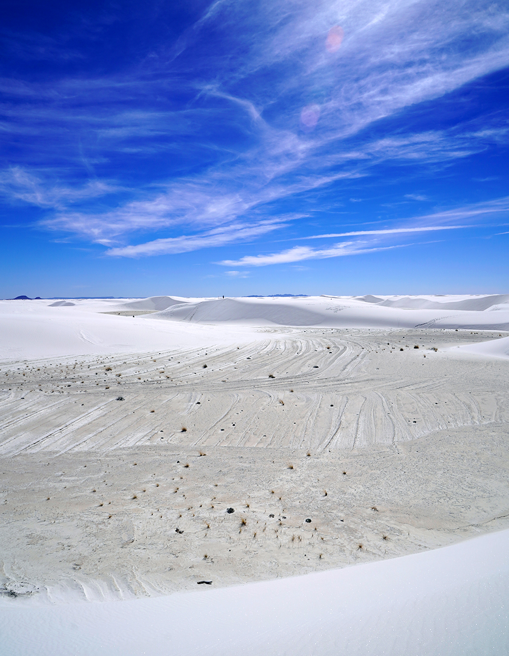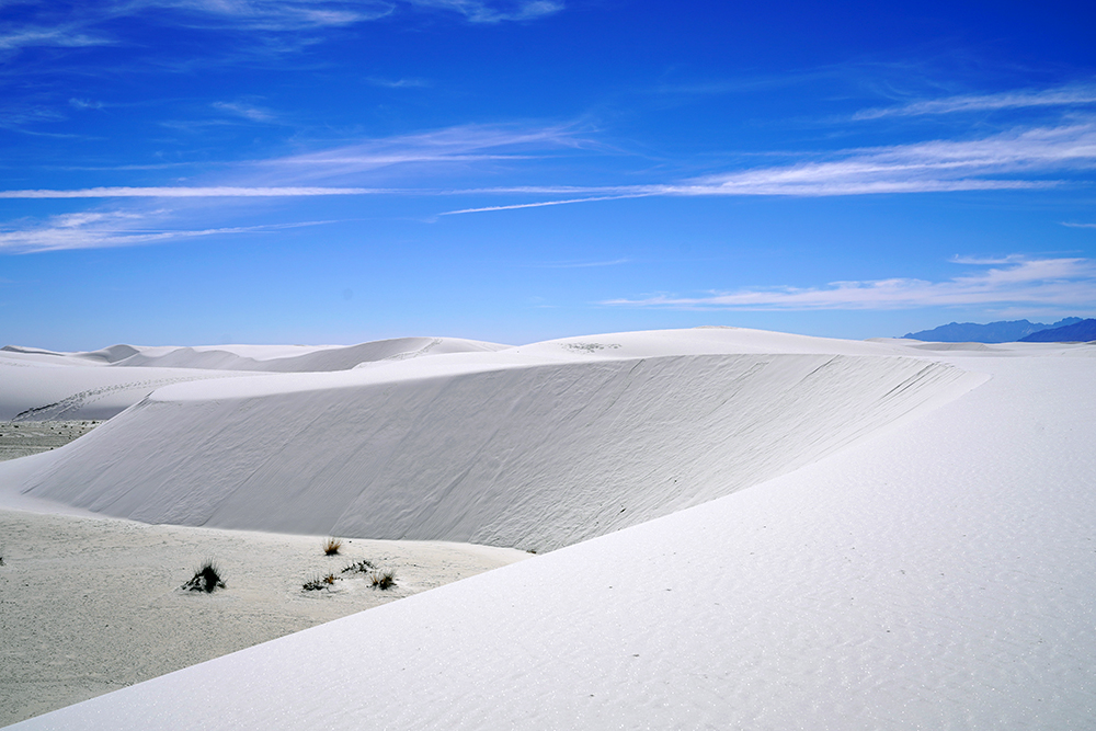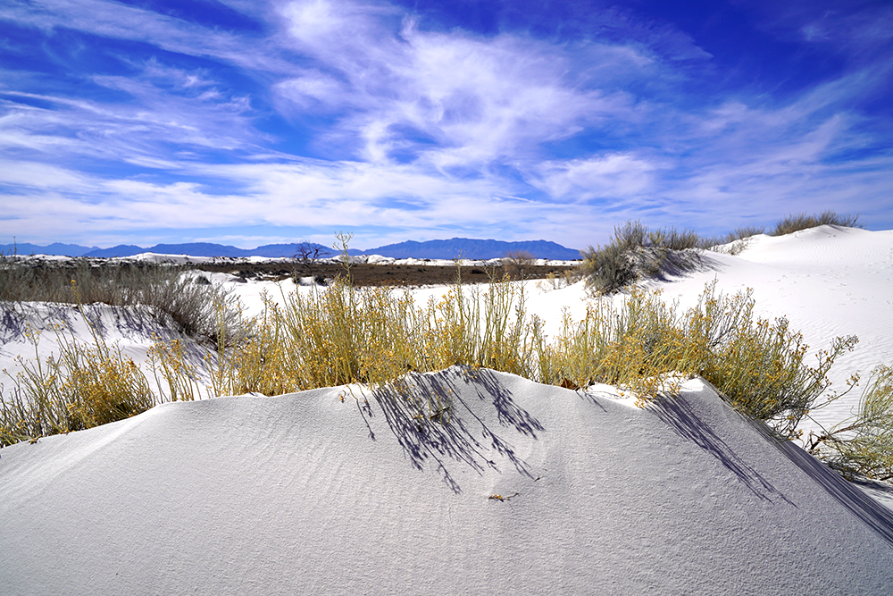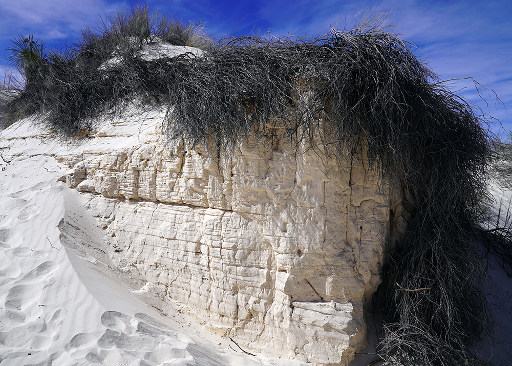 White Sands National Park protects an unique environment of the world largest gypsum (!) dunefield. They formed as an effect of the weathering of Permian gypsum layers in recent desertous conditions. White Sands are white because the dunes are formed by pure gypsum sands. Vegetation on the gypsum dunes. Gypsum dunes in the White Sands NP. Asia on the very white dunes.
