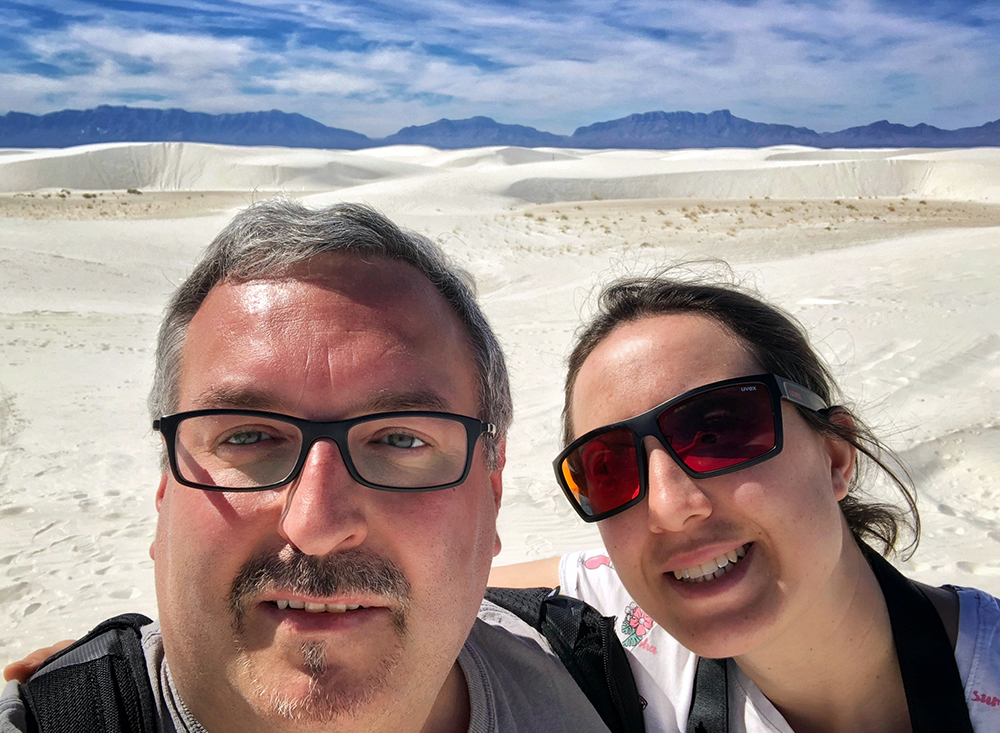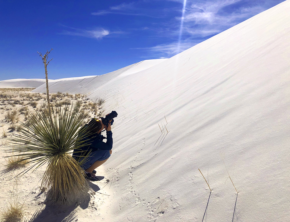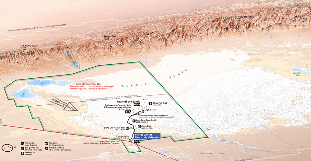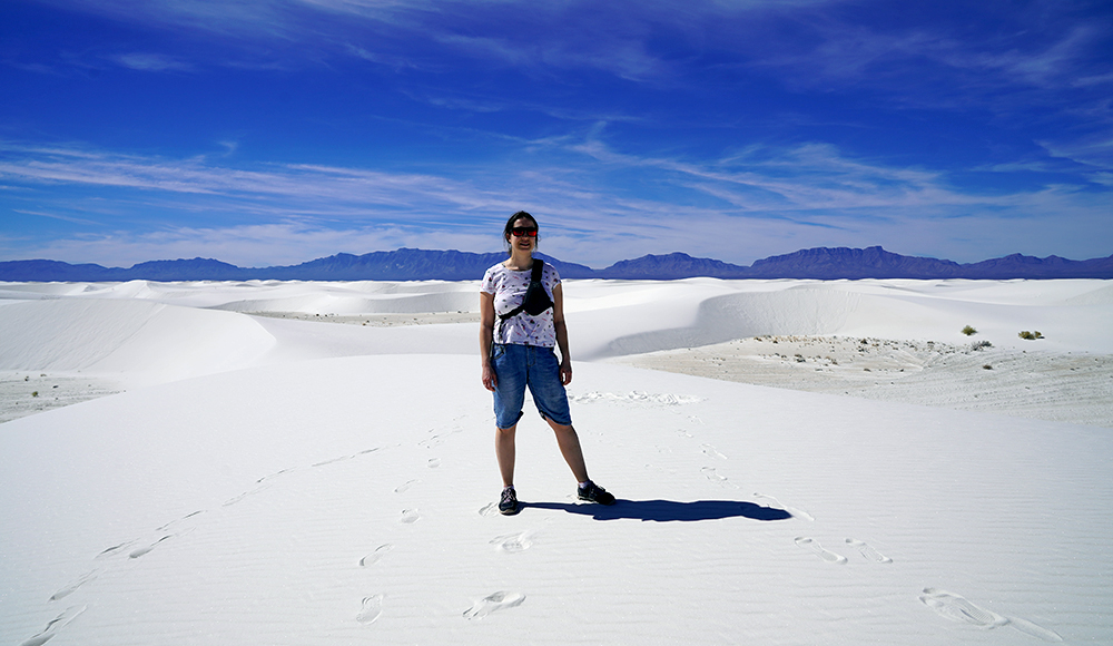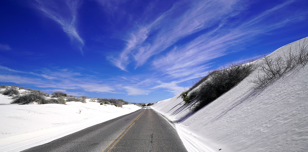 White Sands National Park protects an unique environment of the world largest gypsum (!) dunefield. They formed as an effect of the weathering of Permian gypsum layers in recent desertous conditions. White Sands are white because the dunes are formed by pure gypsum sands. Vegetation on the gypsum dunes. Gypsum dunes in the White Sands NP. Asia on the very white dunes.