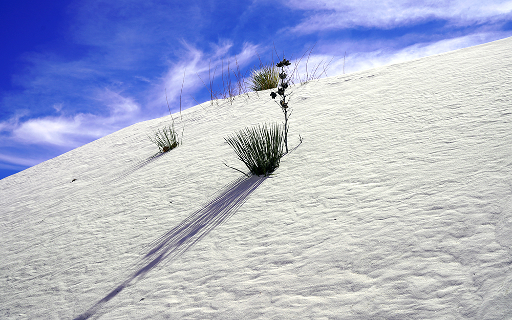 Vegetation in rough conditions of the White Sands NP. White gypsum dunes of the White Sands NP.