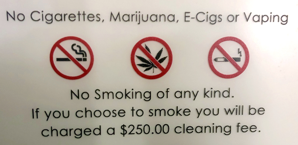 Sign in the hotel in Roswell. Fine for smoking marijuana in the room is 250$, outside it is no problem.