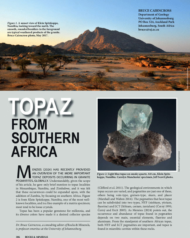 The Kleine Spitzkoppe area is especially famous for pegmatites that bear gem-quality topaz. Full articles about the locality can be downloaded HERE and HERE.