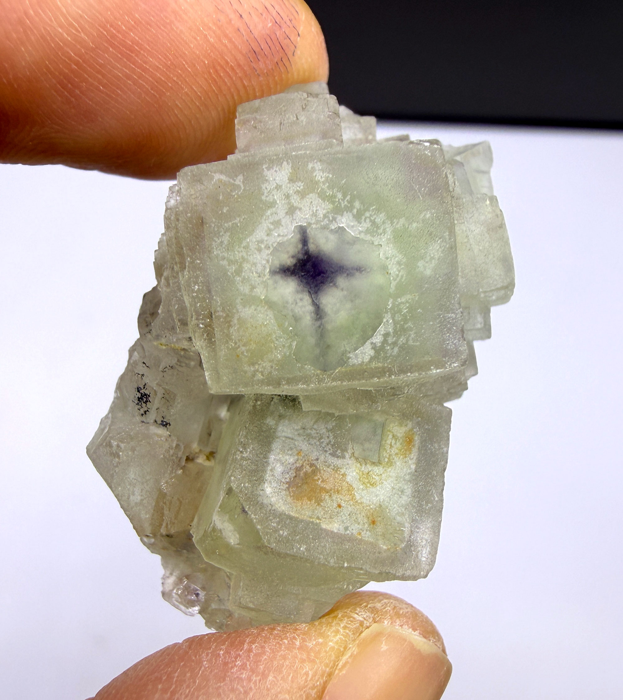 “Dragon Eye”–style fluorite specimen (without backlighting). This is one of the specimens that, when backlit, reveal a purple-to-pink cross at the center of the crystal (see following photo). Spirifer Minerals specimen and photo.