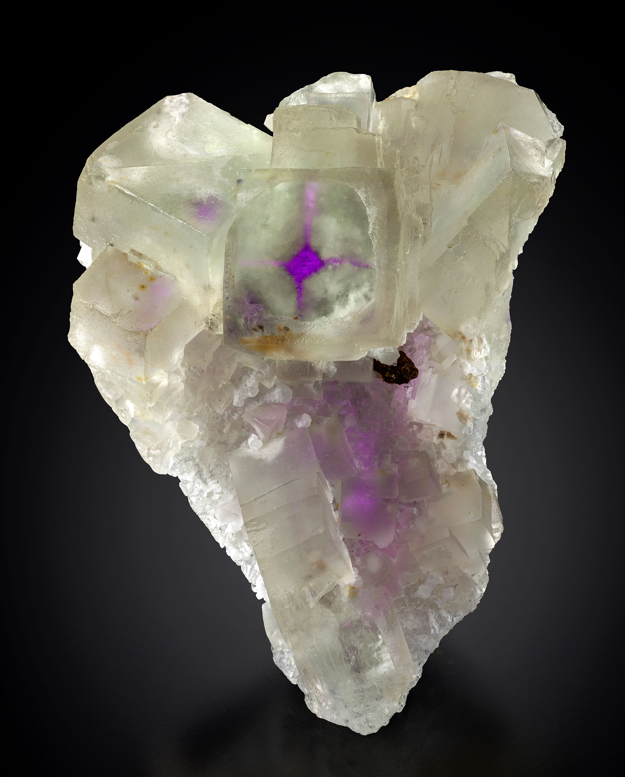 “Dragon Eye”–style fluorite specimen (without backlighting). This is one of the specimens that, when backlit, reveal a purple-to-pink cross at the center of the crystal (see following photos). Spirifer Minerals specimen and photo.