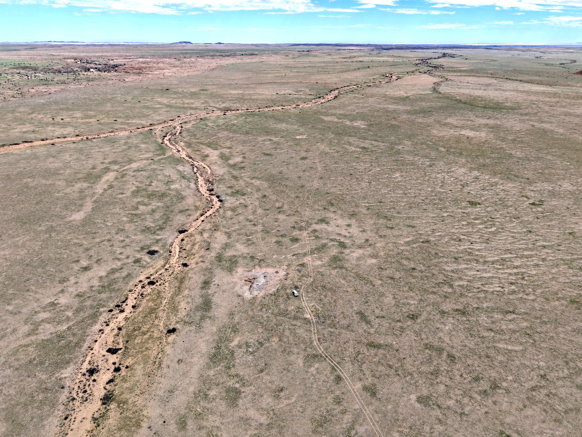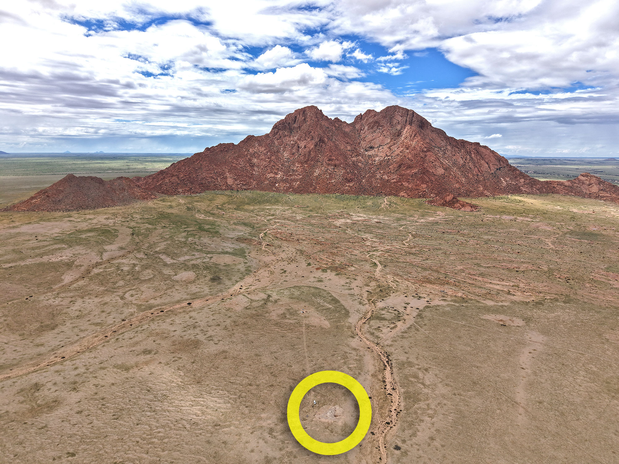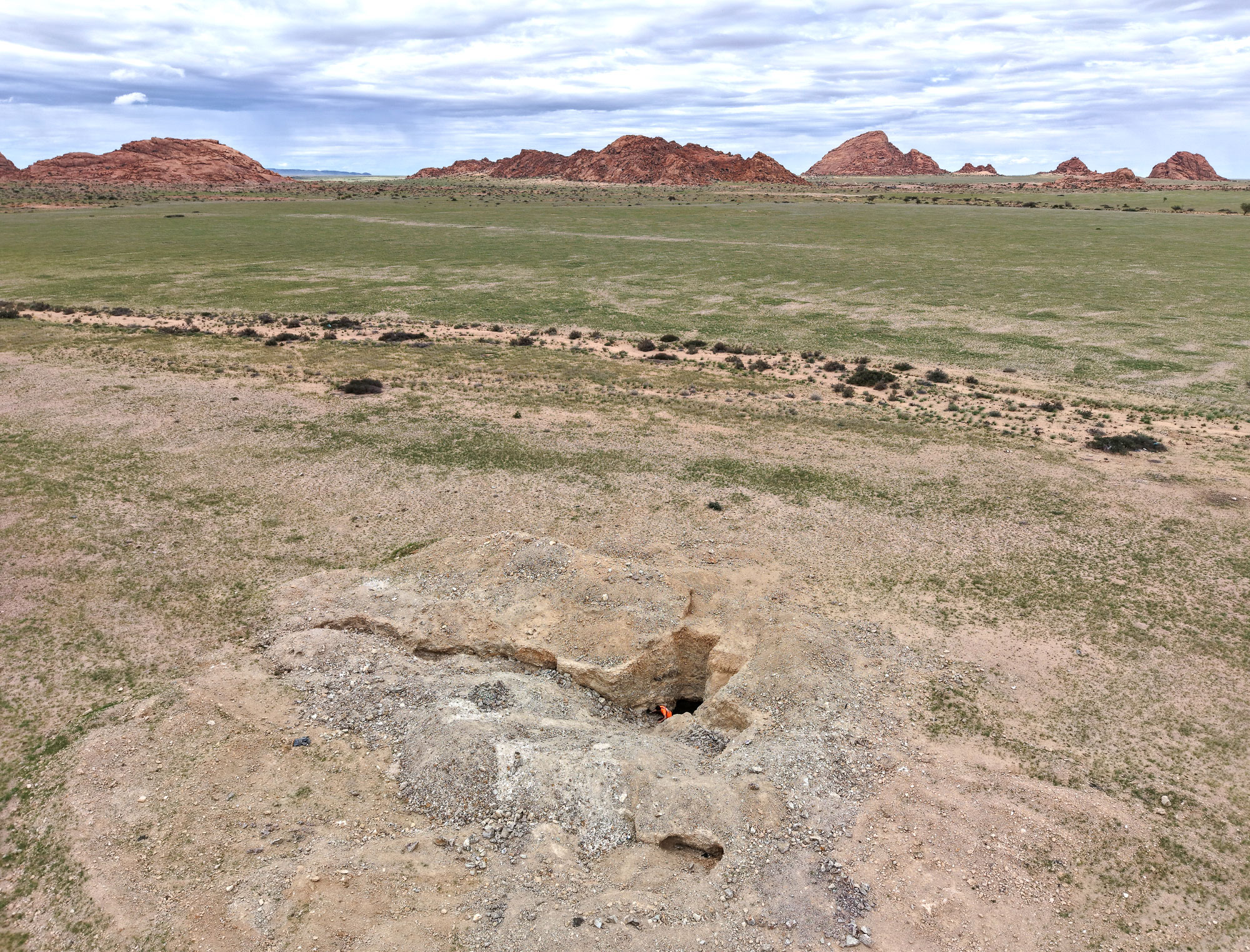 Fluorite workings surrounded by a flat, desert plain (view to the east). Spirifer Minerals photo.