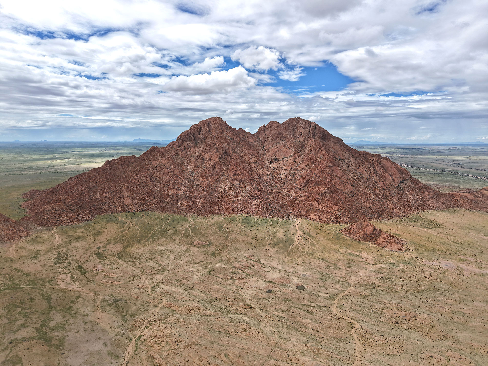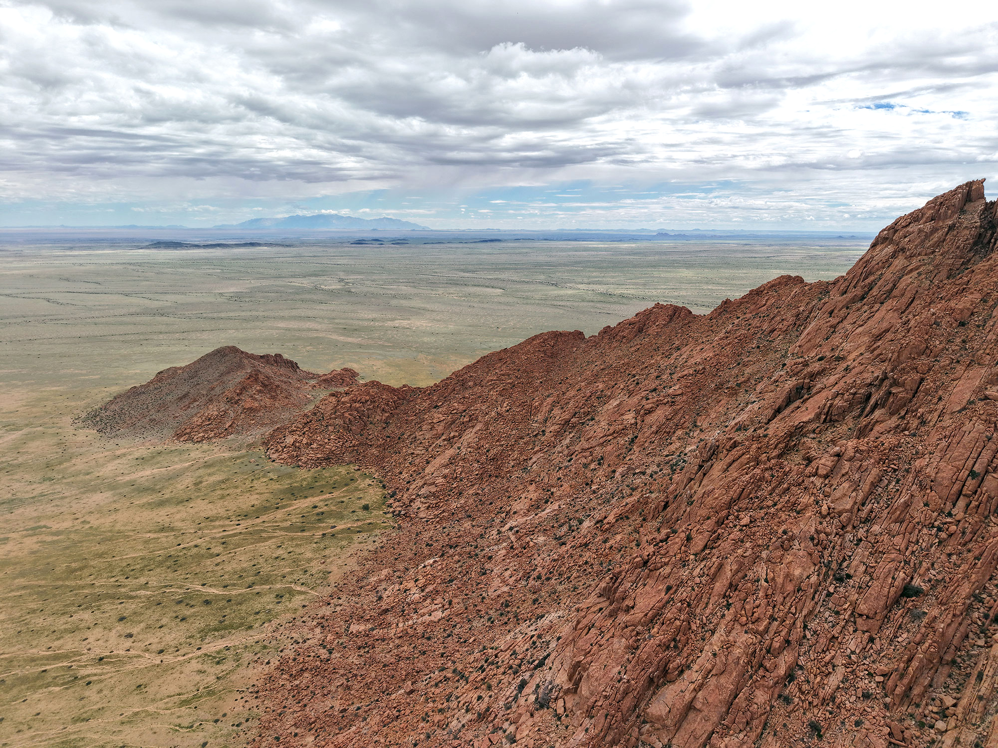 Granite peaks of the Kleine Spitzkoppe rising from the flat, arid desert plain. Spirifer Minerals photo.