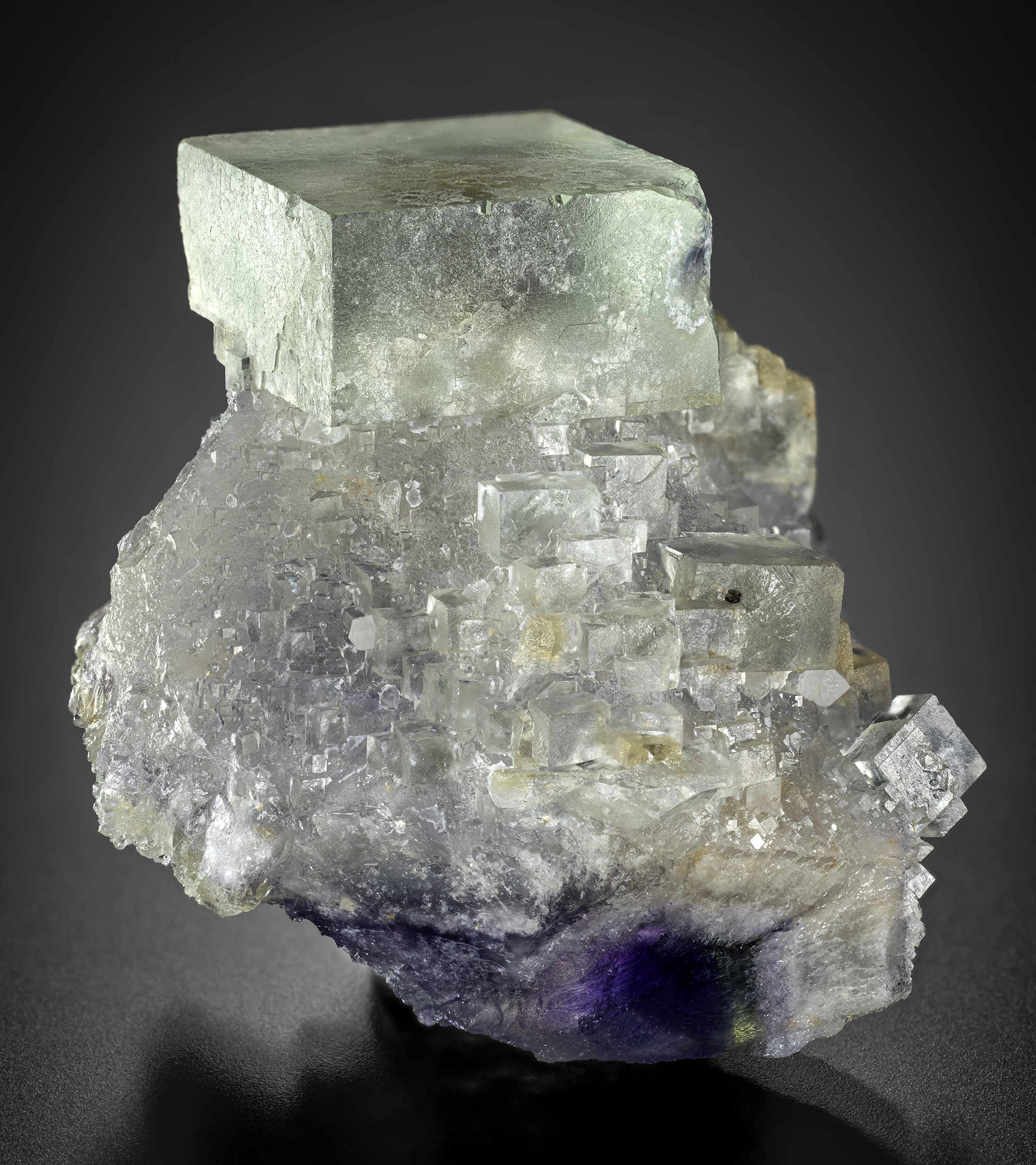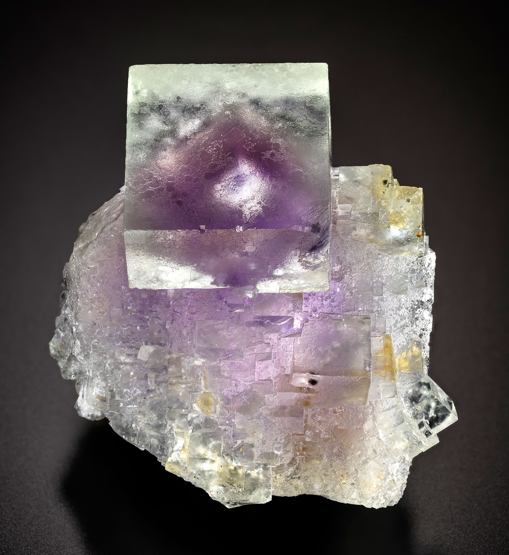The following three photos show the same specimen from different angles. This fluorite originally grew as octahedra; over time, the growth habit changed to cubic crystals, which grew syntactically on the earlier crystals, forming the so-called “Aztec Pyramid” form. Spirifer Minerals specimen. Laszlo Kupi photo.