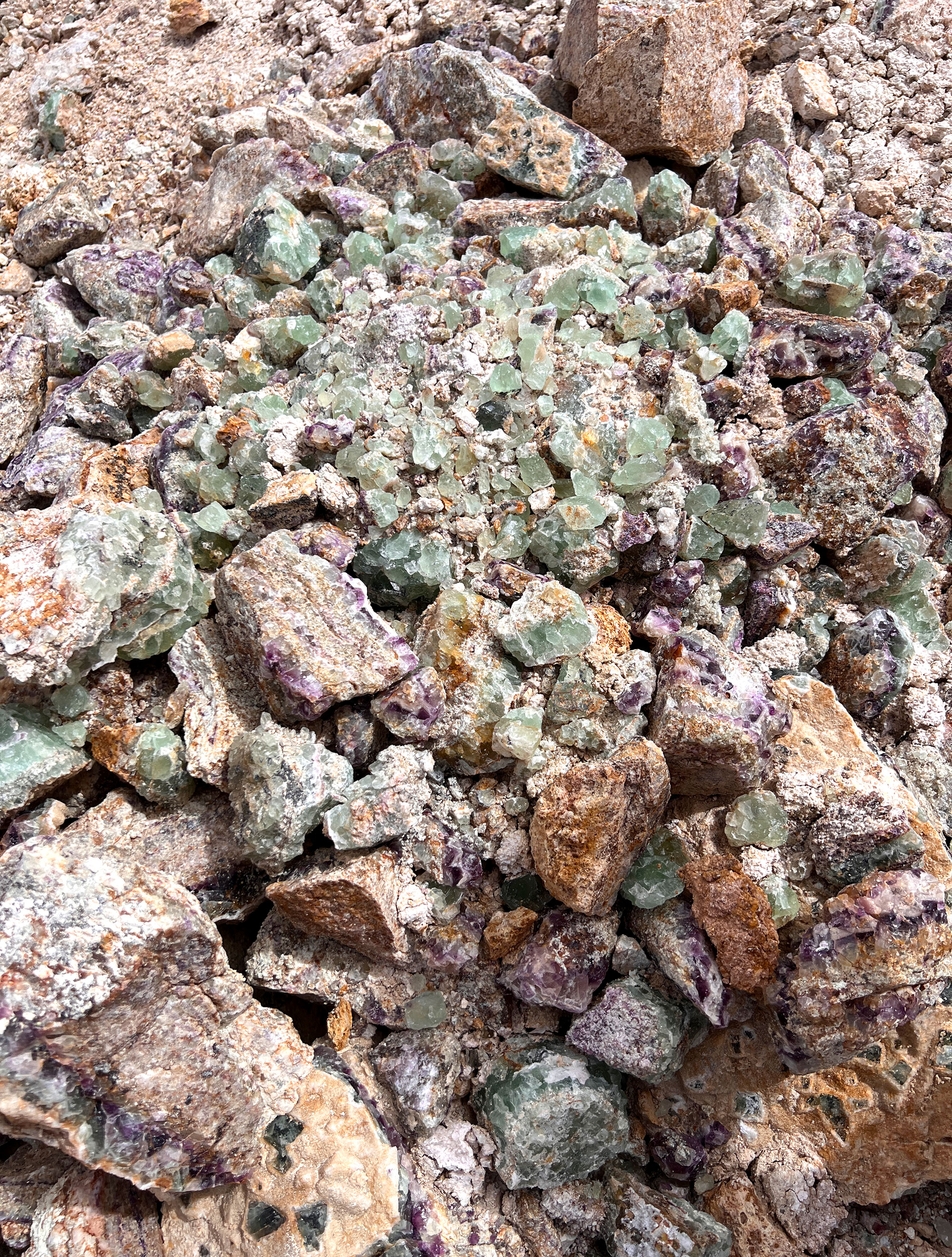 Dump with chunks of colorful fluorite. The fluorite was mined there mainly for industrial purposes. Spirifer Minerals photo.