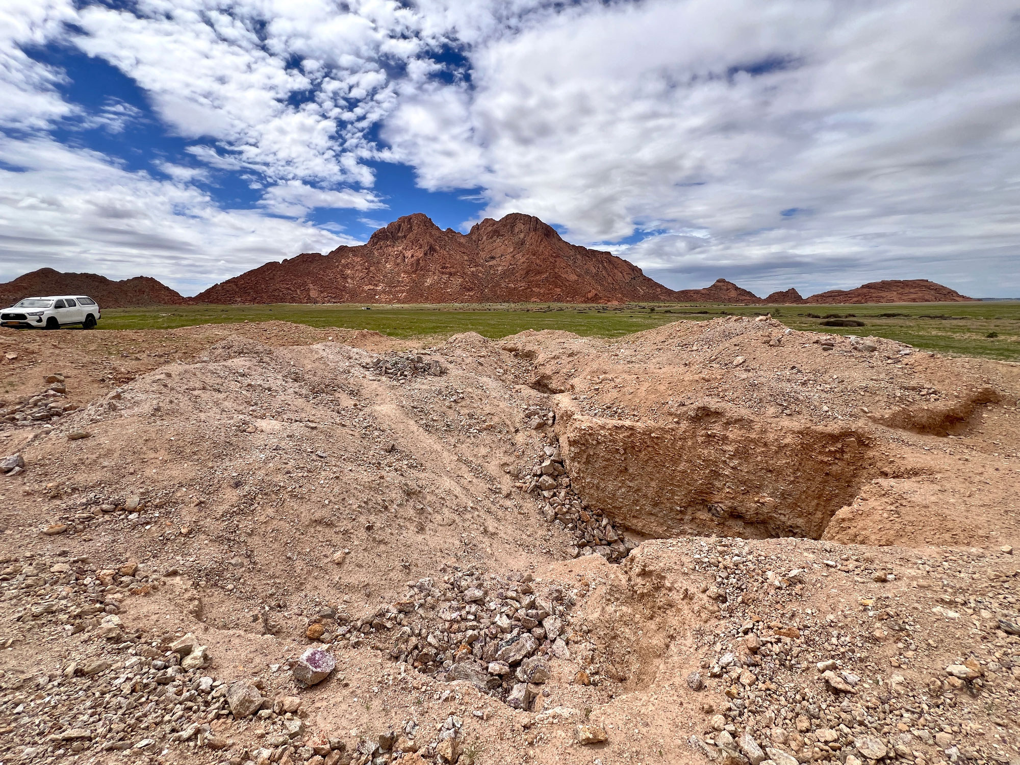 Fluorite workings with the granite peaks of the Spitzkoppe in the background. Spirifer Minerals photo.