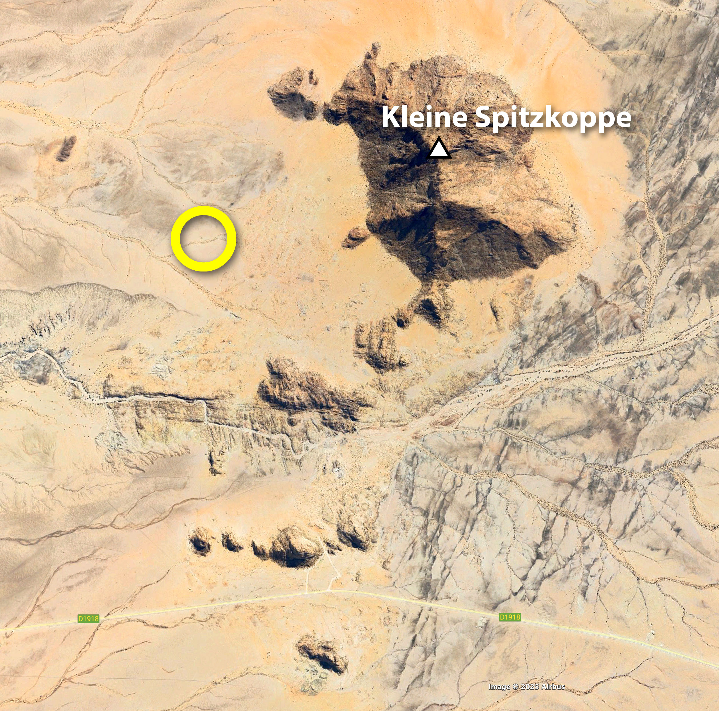 Fluorite workings (marked) located at the foot of the granite peaks of the Kleine Spitzkoppe. Spirifer Minerals photo.