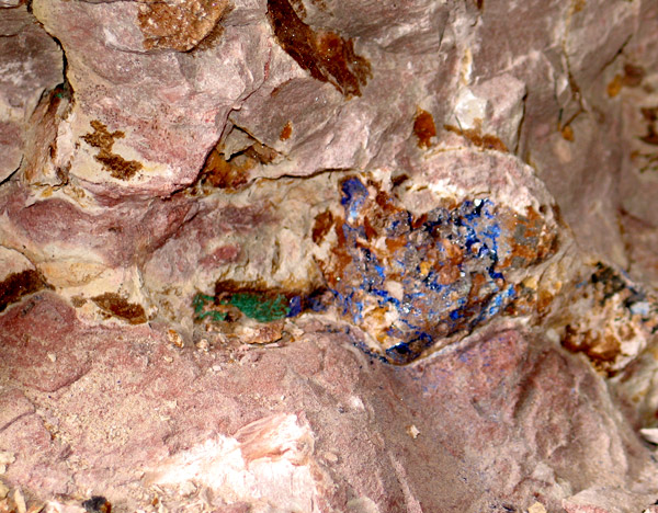 Azurite and malachite in small pockets in limestones in Kerrouchene workings. Fot. K. Dembicz.