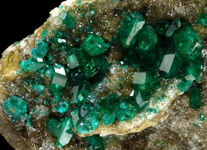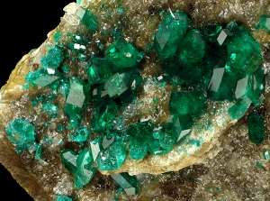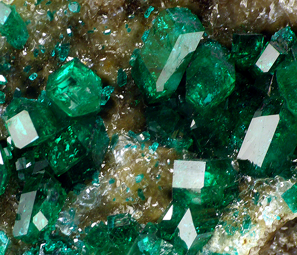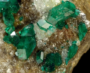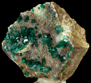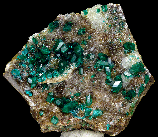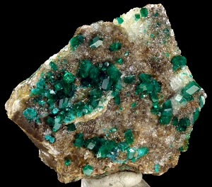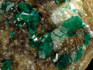 Great specimen of lustrous dioptase crystals in emerald color, combined with calcite. Great color and luster.