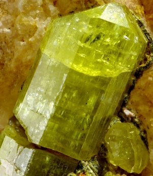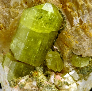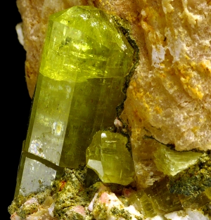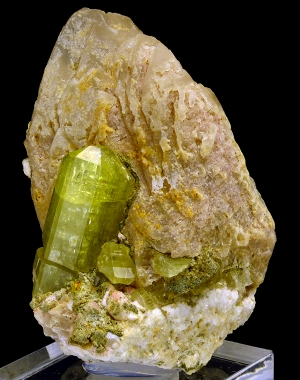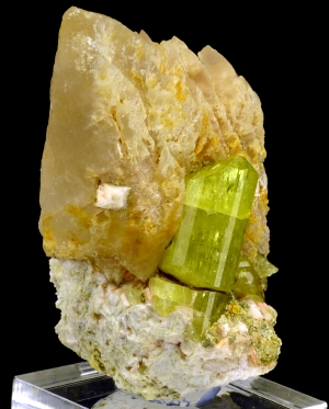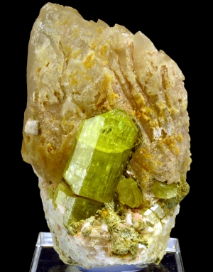 Sharp, gemmy and lustrous apatite crystal in very good intensive green color, with calcite, on feldspar matrix. Good contrast. Crystal size is: 2.5 x 1.3 cm.