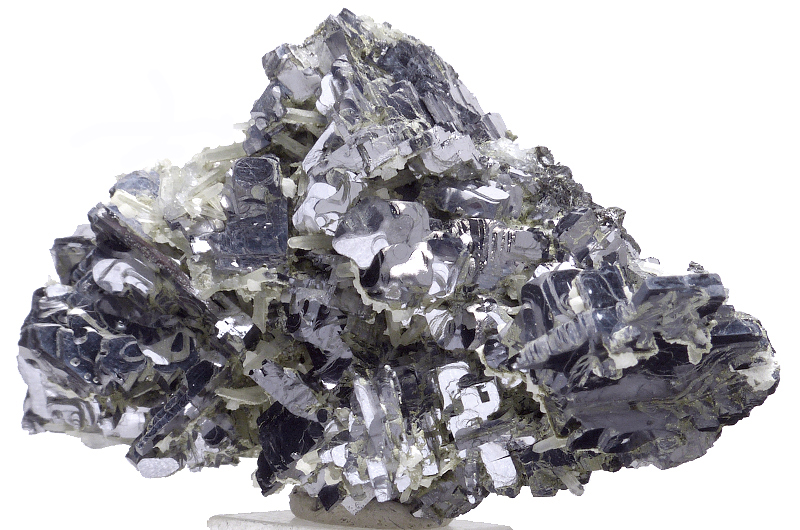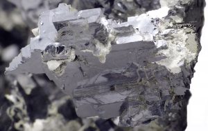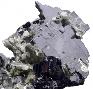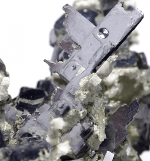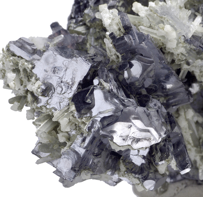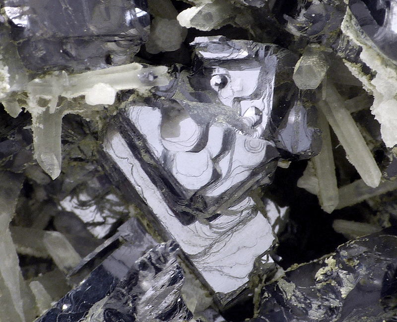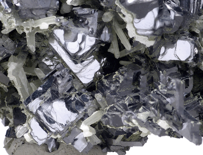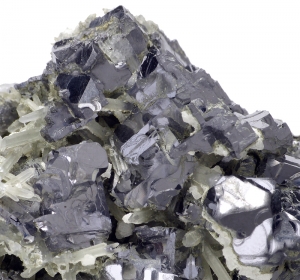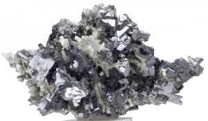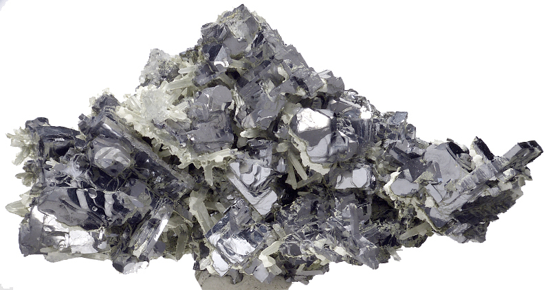 Very lustrous and sharply formed, galena crystals with quartz and calcite. Good, skeletal form. Great luster.