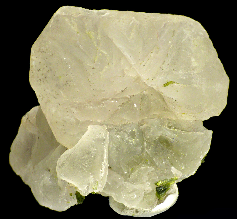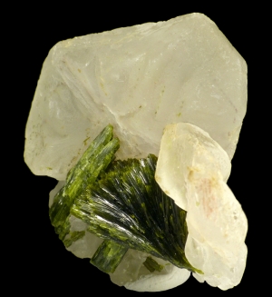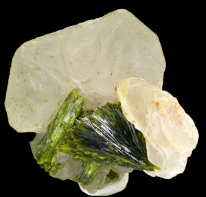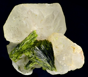 Interesting specimen of green epidote on contrastive calcite. Good color and luster.