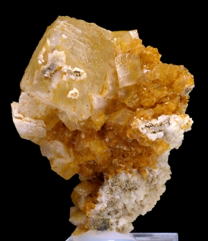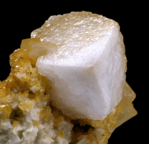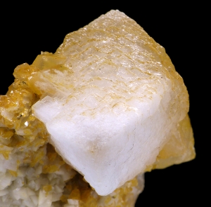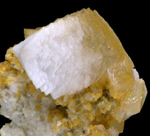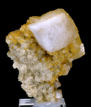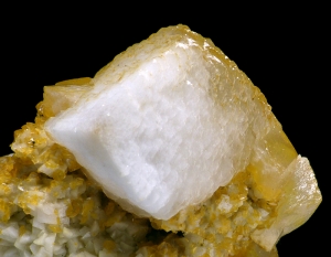Interesting specimen of sharp, white calcite crystal on orangish matrix. Crystal size is 2.5 x 1.8 cm. Unusual location.