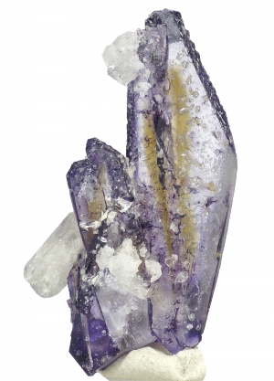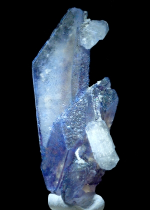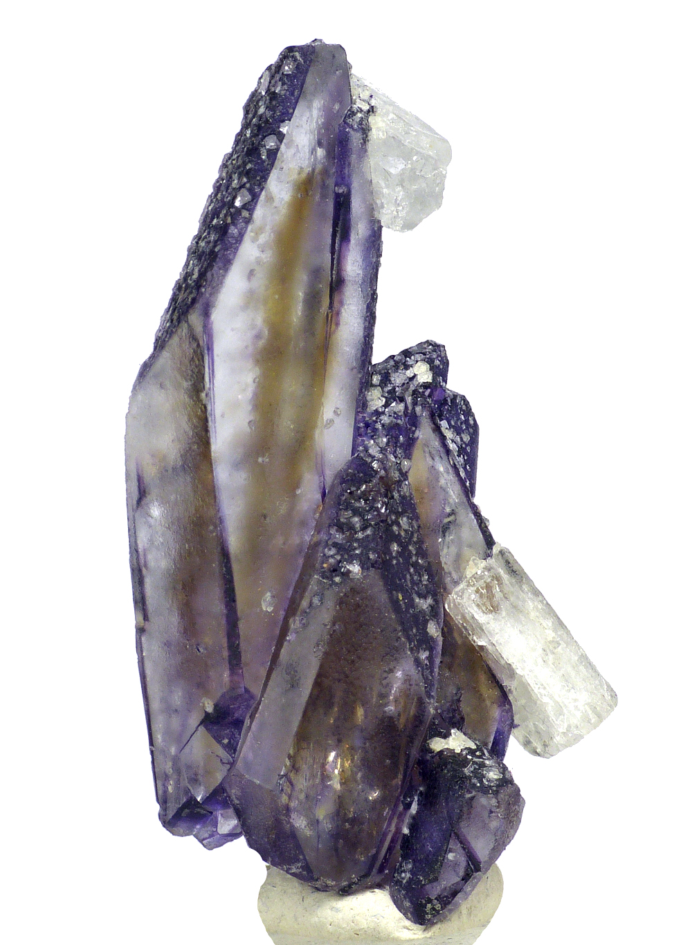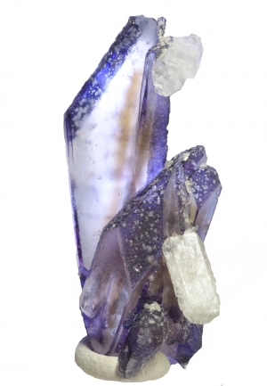 Unusual elongated "faden-style" spinel law twinned fluorite crystals with grat color zoning. Combined with beryl. Fluorescent under UV light.