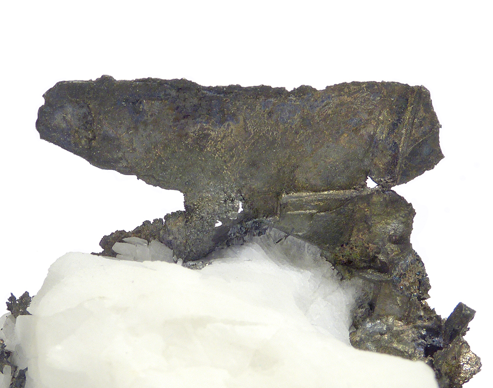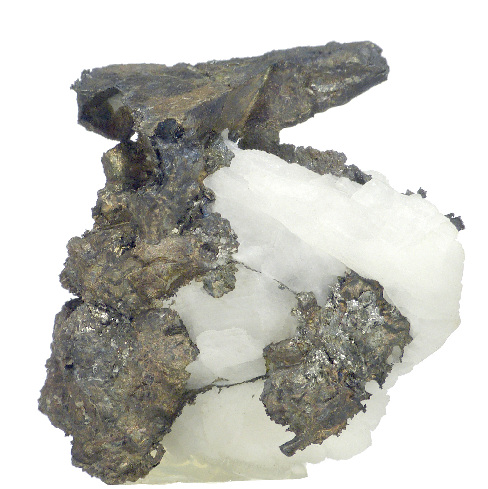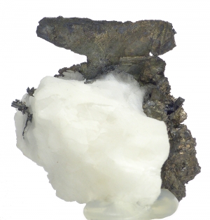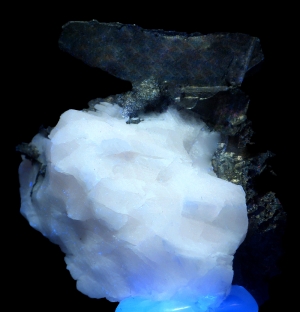 Specimen of lustrous and well formed crystals of very rare silver mineral - allargantum pseudmorph after dyscrasite combined with silver on calcite matrix. Calcite is fluorescent under UV light.