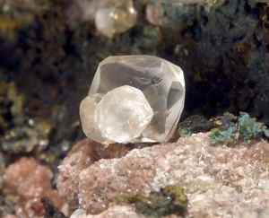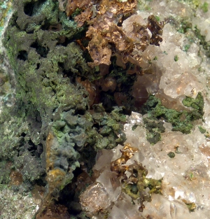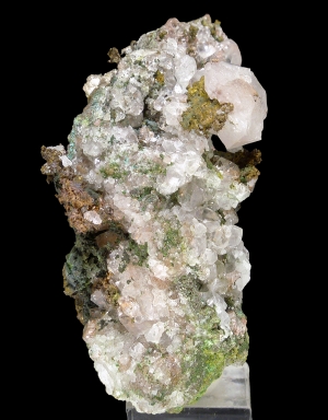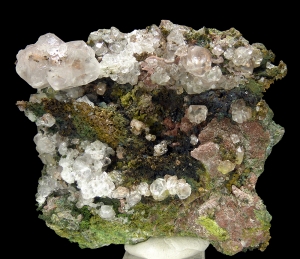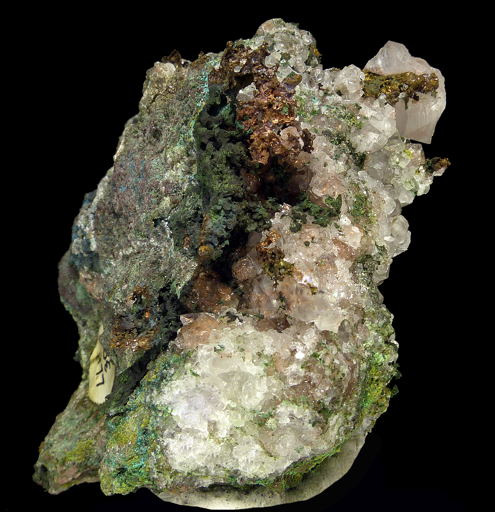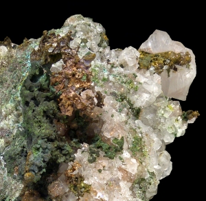 Classic, colorful specimen of sharp and lustrous calcite crystals combined with copper on epidote rich matrix.