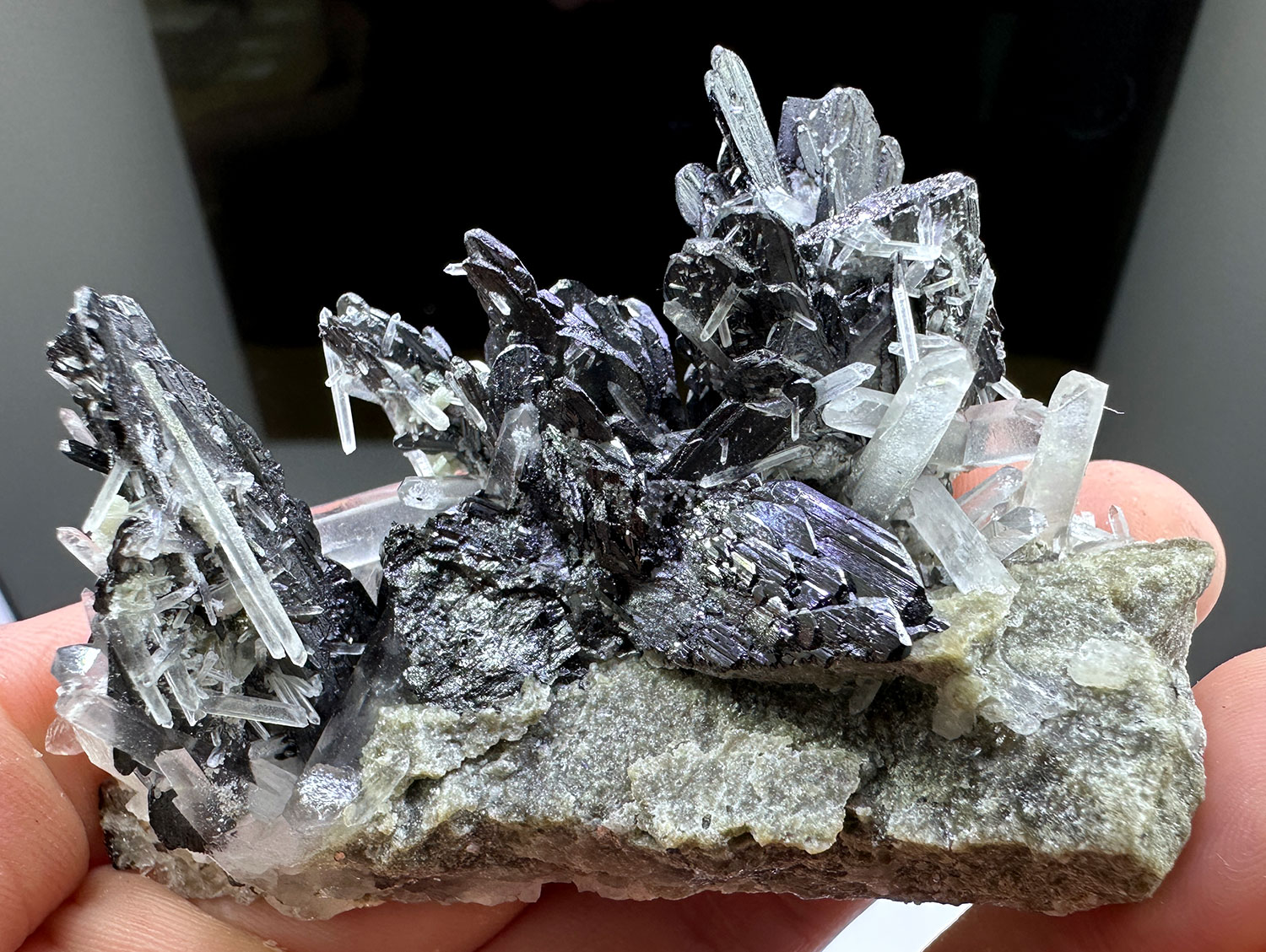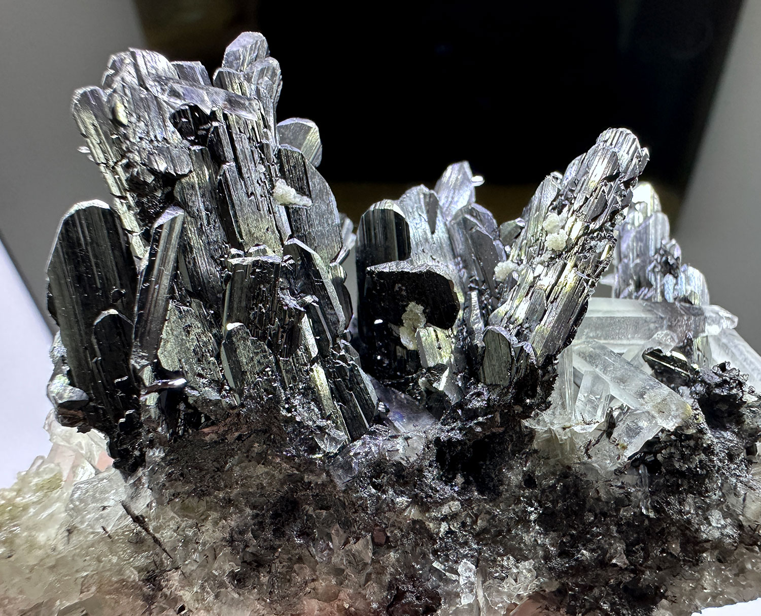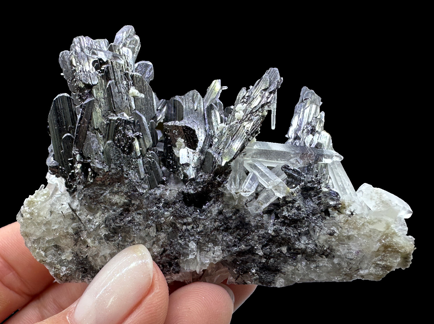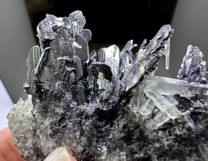 Showy cluster of spiky ferberite crystals with quartz on matrix. Good luster.