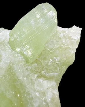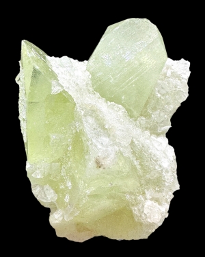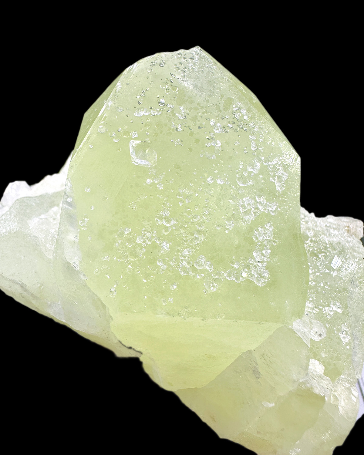 Classic specimen of lustrous datolite light green crystals overgrown by sparkly fluoroapophyllite. Ex. Spirifer collection, from our trim to Dalnegorsk in 2001.