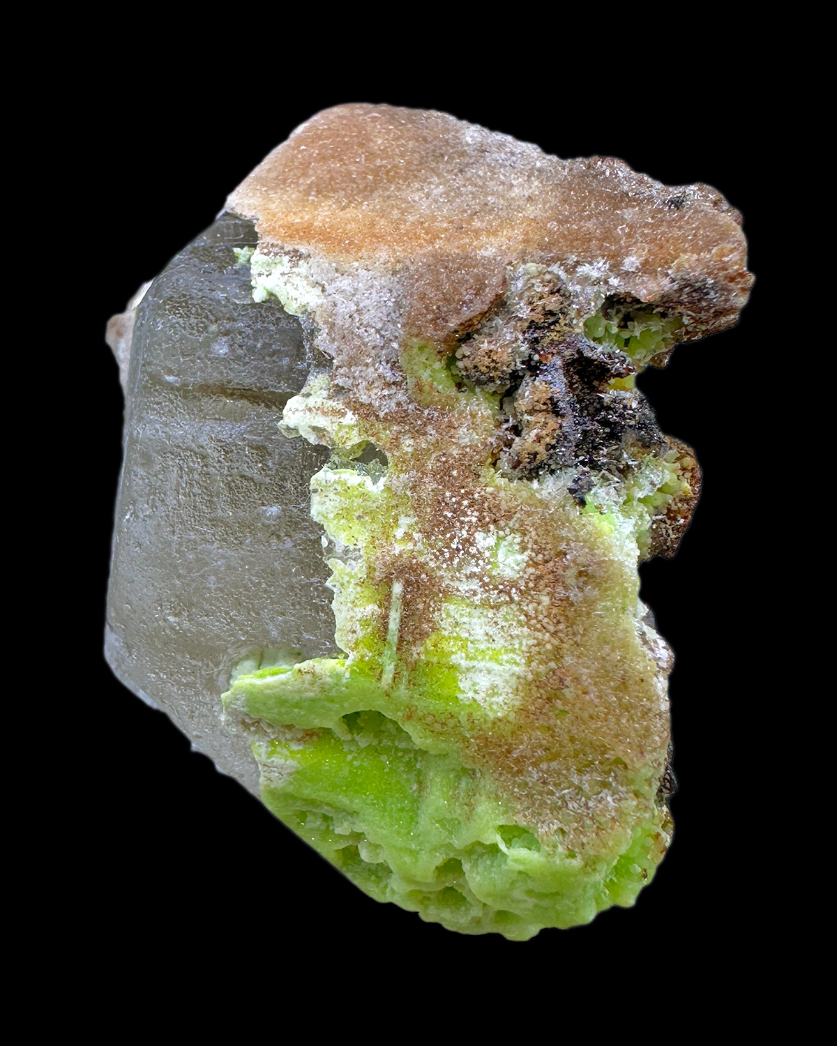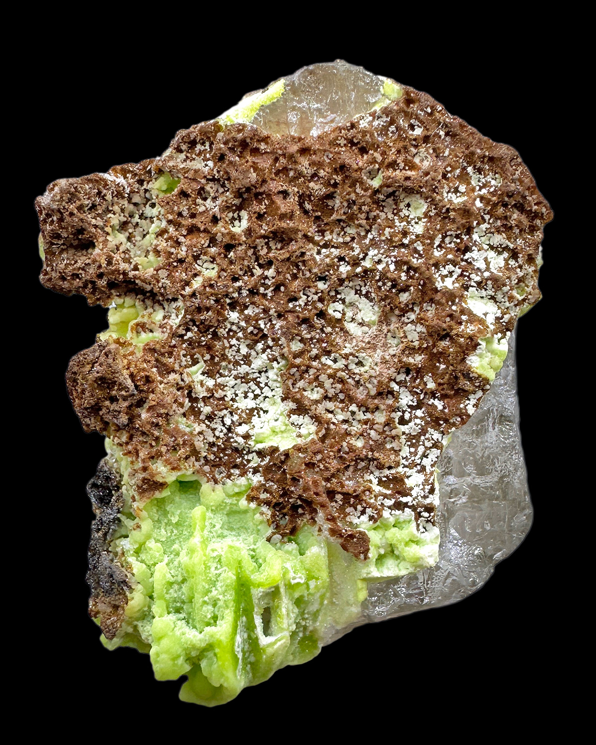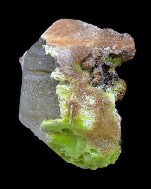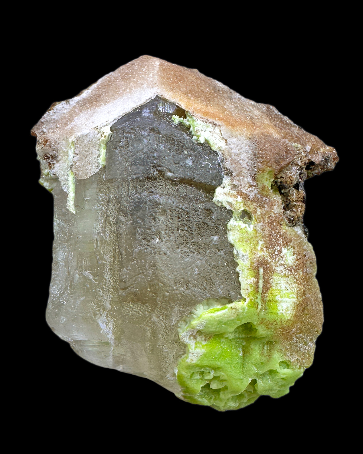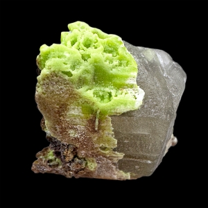 Interesting specimen of cerussite crystal partly replaced by green to brownish phosphohedyphane.