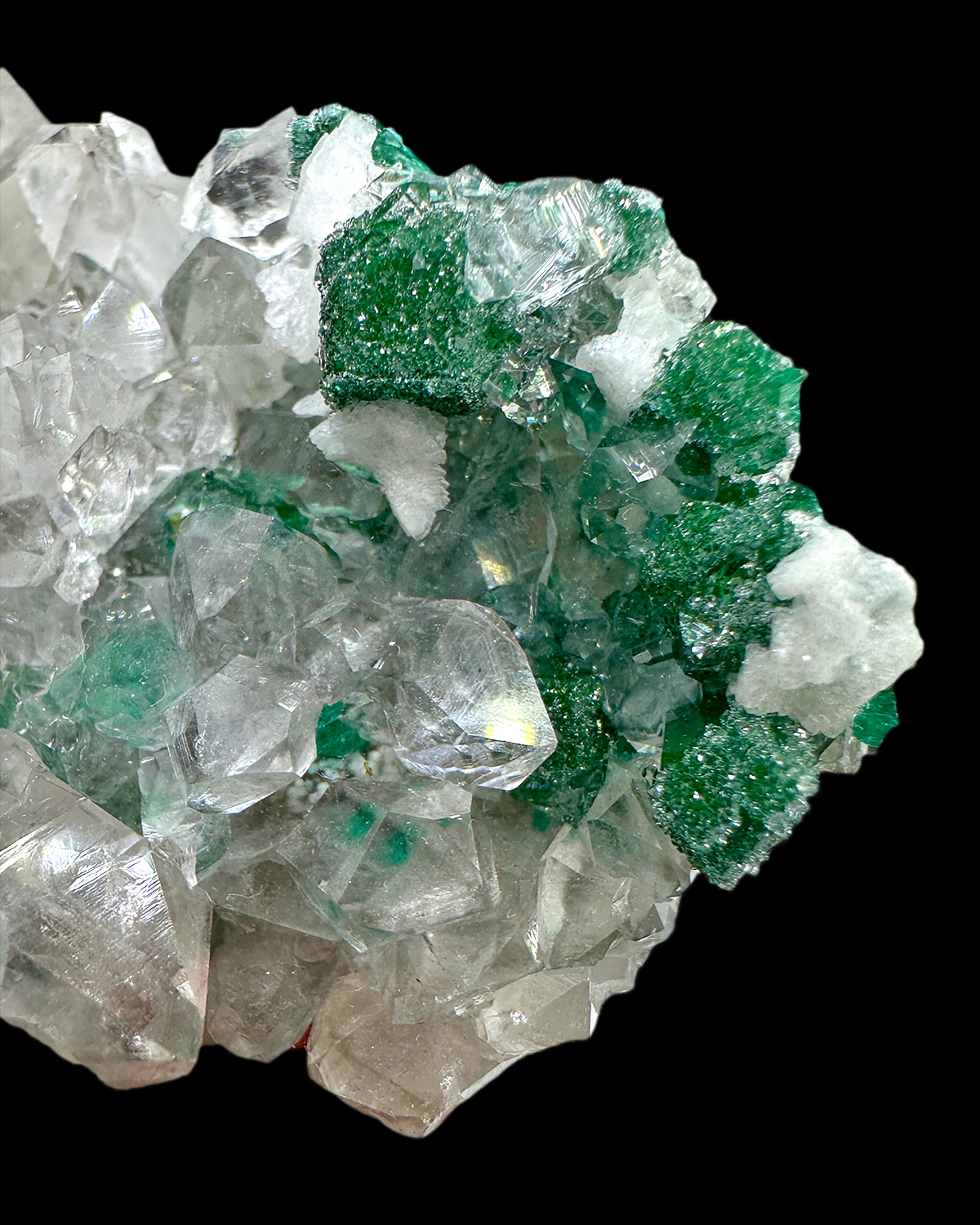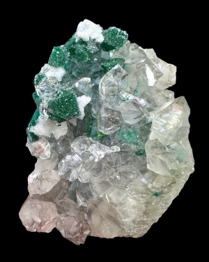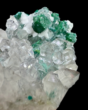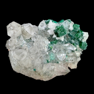 Sparkly specimen of shiny quartz crystals with gemmy emerald green dioptase crystals with white calcite. Great luster. Better in person.