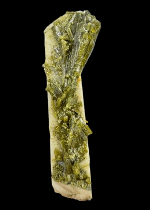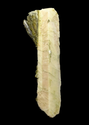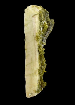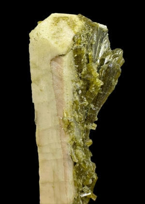Elongated and twinned (Baveno twin) microcline crystal overgrown by green epidote. Cute!  Ex. Thomas Körber collection.