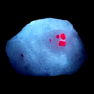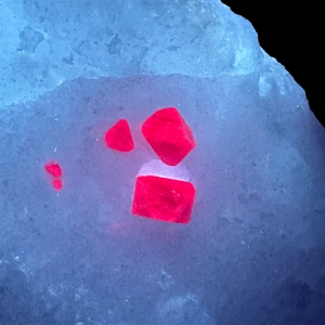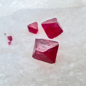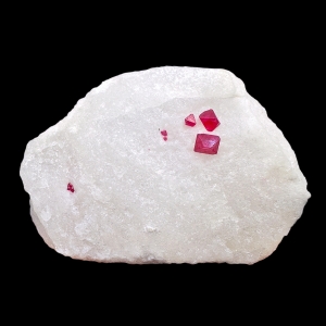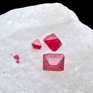 Lustrous crystals of red spinel, on contrastive white marble matrix. Great color. Fluorescent under UV light.