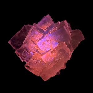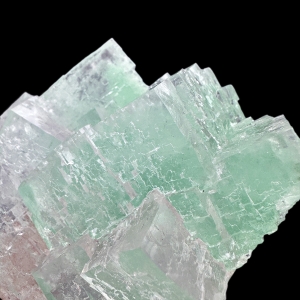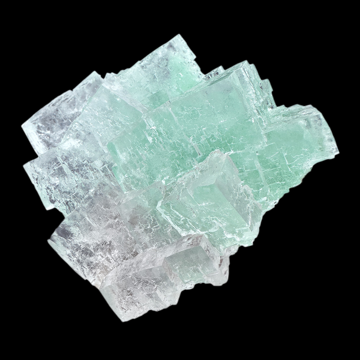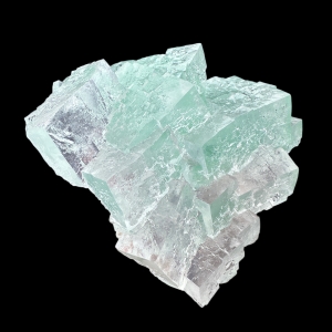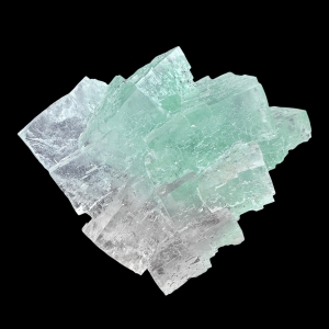 Cluster of bi-color, translucent and lustrous halite crystals. Green color caused by paratacamite inclusions. Fluorescent under UV light.