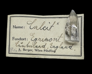 Lustrous calcite crystal from Cumbria, with an old label. Classic! Ex. A. Berger collection.