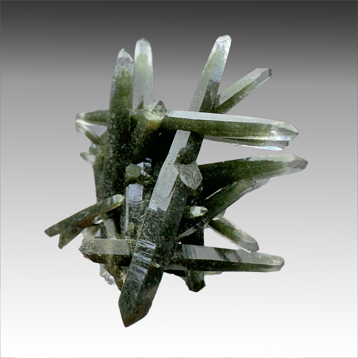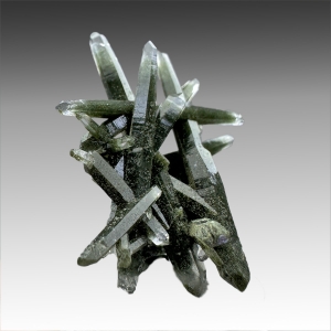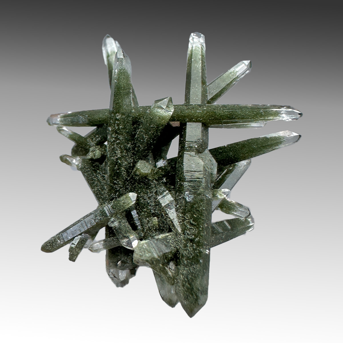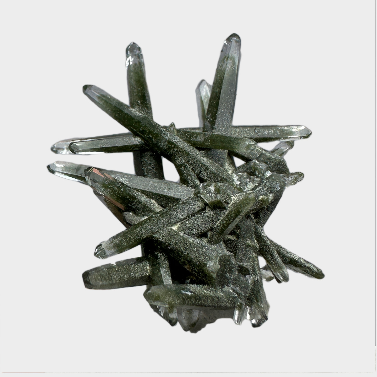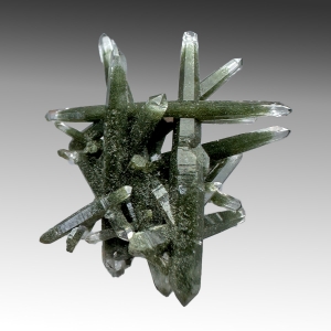 Cluster of sharp and lustrous quartz crystals, included by green chlorite. Cool form.