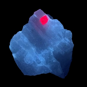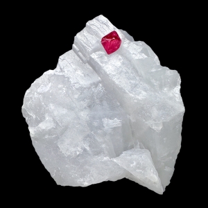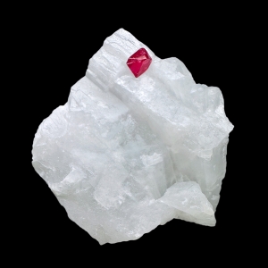 Lustrous crystal of red spinel, on contrastive white marble matrix. Great color. Fluorescent under UV light.