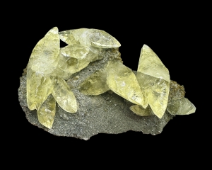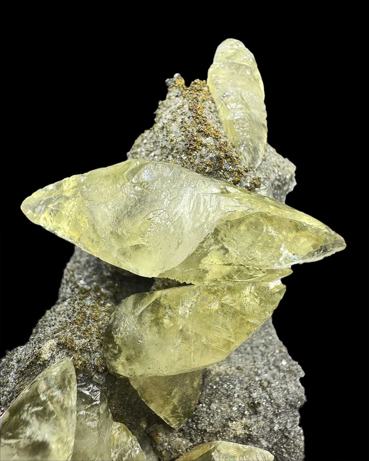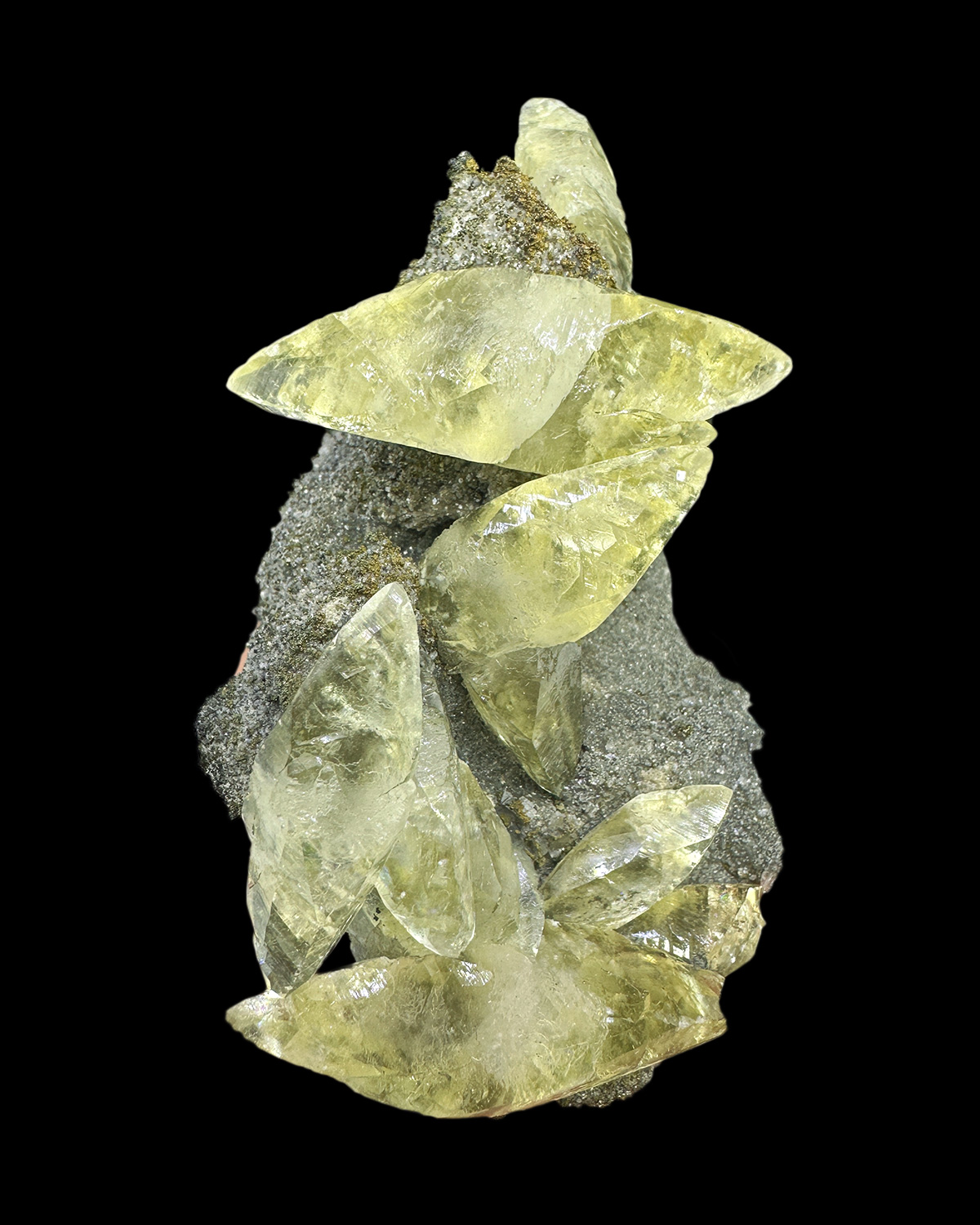 Aesthetic specimen of well-formed, mostly double ended, yellow calcite crystals, with sparkly pyrite, on matrix. Classic.