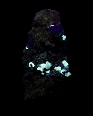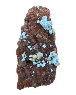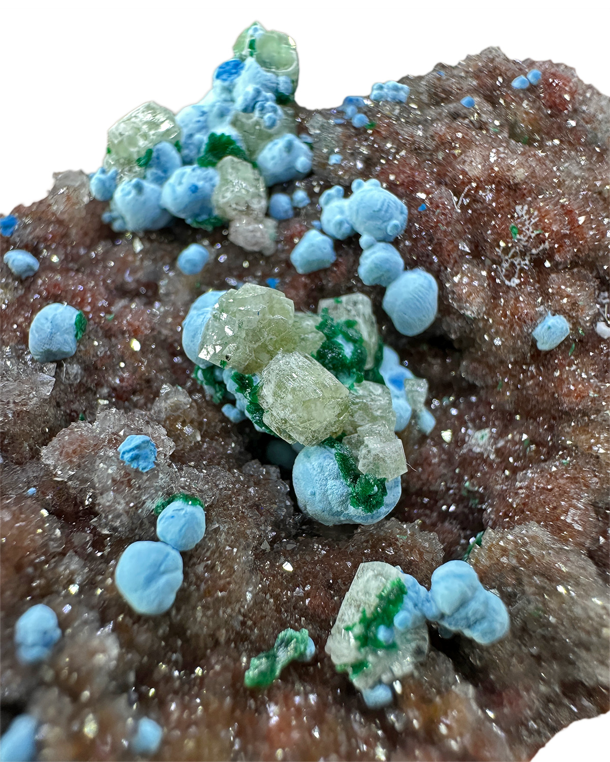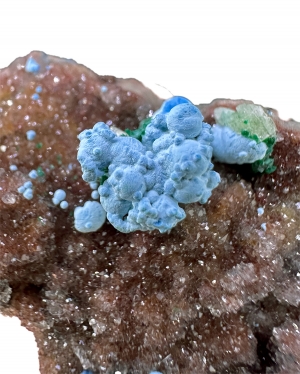Great multi-mineral combo with relatively large crystals of willemite and blue plancheite spheres – "blue freckles", on sparkly quartz. Minor malachite. Willemite is strongly fluorescent.