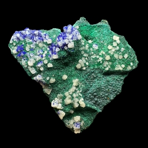 Great combo of malachite and electric blue azurite with cerussite "snowflakes" sprinkles. From 2024 find in Republic of the Congo.