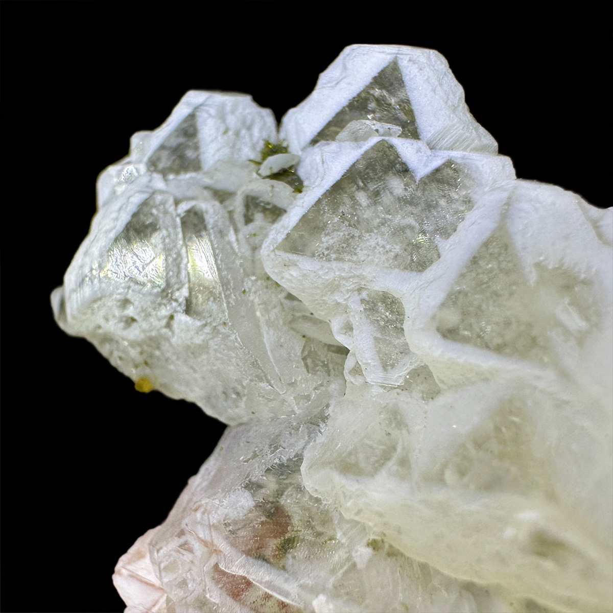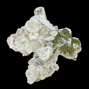 Unusual aggregate of calcite crystals, with epidote on the back. Good luster.
